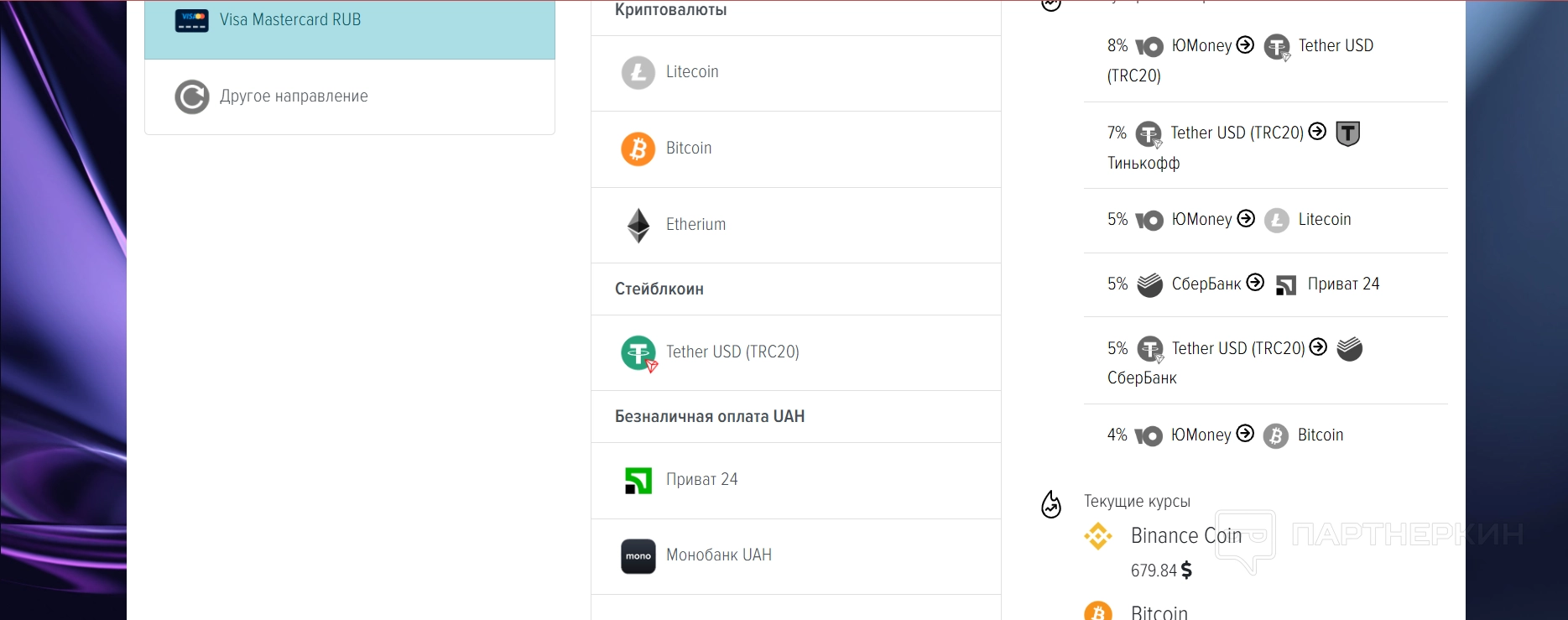 Если обмениваем фиатные рубли, возможна покупка криптовалют, стейблкоинов или обмен средств на украинские гривны (UAH) с выводом на украинские банки.