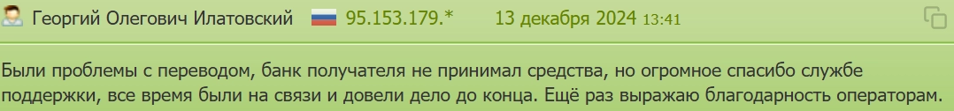 Пользователи высоко оценивают оперативность и профессионализм службы поддержки сервиса. Даже в случае проблем с переводами, связанных с отказом банков, специалисты оперативно реагируют и доводят процесс до завершения, оставаясь на связи с клиентами.