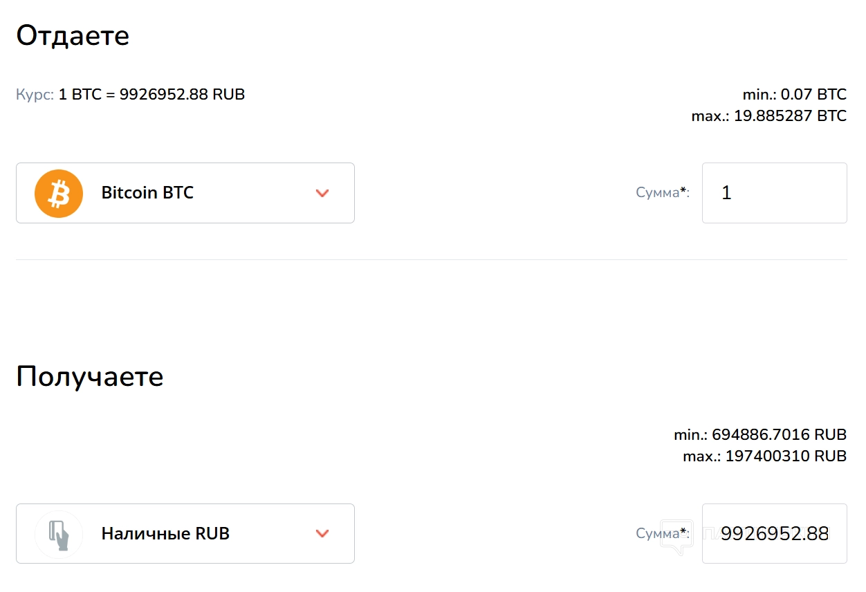 Минимальная сумма для обмена составляет 0.07 BTC (около 694 886 рублей), а максимальная — внушительные 19 BTC (более 190 миллионов рублей), что делает платформу подходящей как для частных пользователей, так и для крупных игроков.