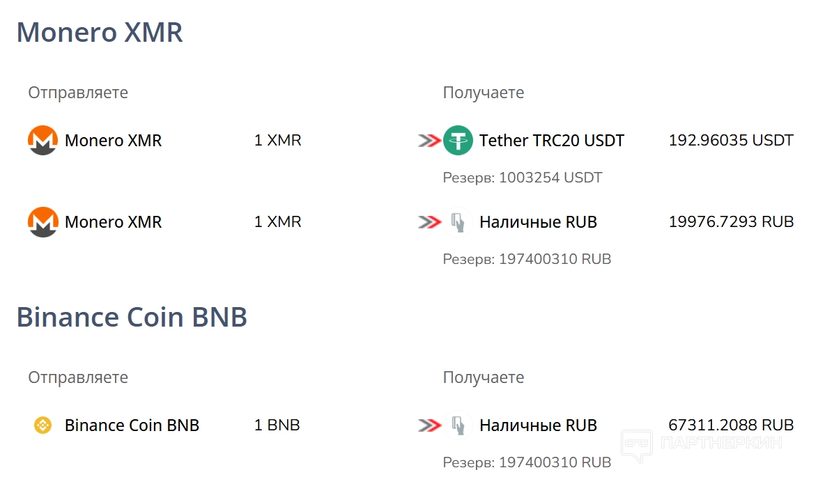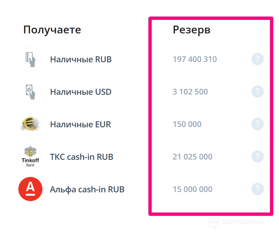 На сайте указаны актуальные курсы обмена и доступные резервы валют. Например, резервы на момент обзора включают 197 миллионов рублей для наличных и значительные суммы в других направлениях (21 миллион рублей для Tinkoff cash-in, 15 миллионов рублей для Альфа cash-in). Это говорит о том, что платформа готова обработать крупные заявки.