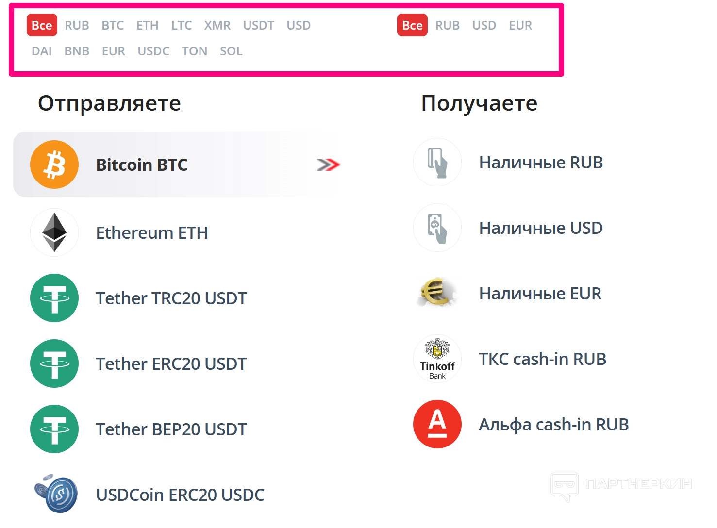 Сервис поддерживает широкий выбор криптовалют, включая основные направления, такие как Bitcoin (BTC), Ethereum (ETH), Tether (TRC20, ERC20, BEP20), USD Coin, Litecoin, Solana и другие. Фиатные валюты представлены в российских рублях, долларах США и евро.