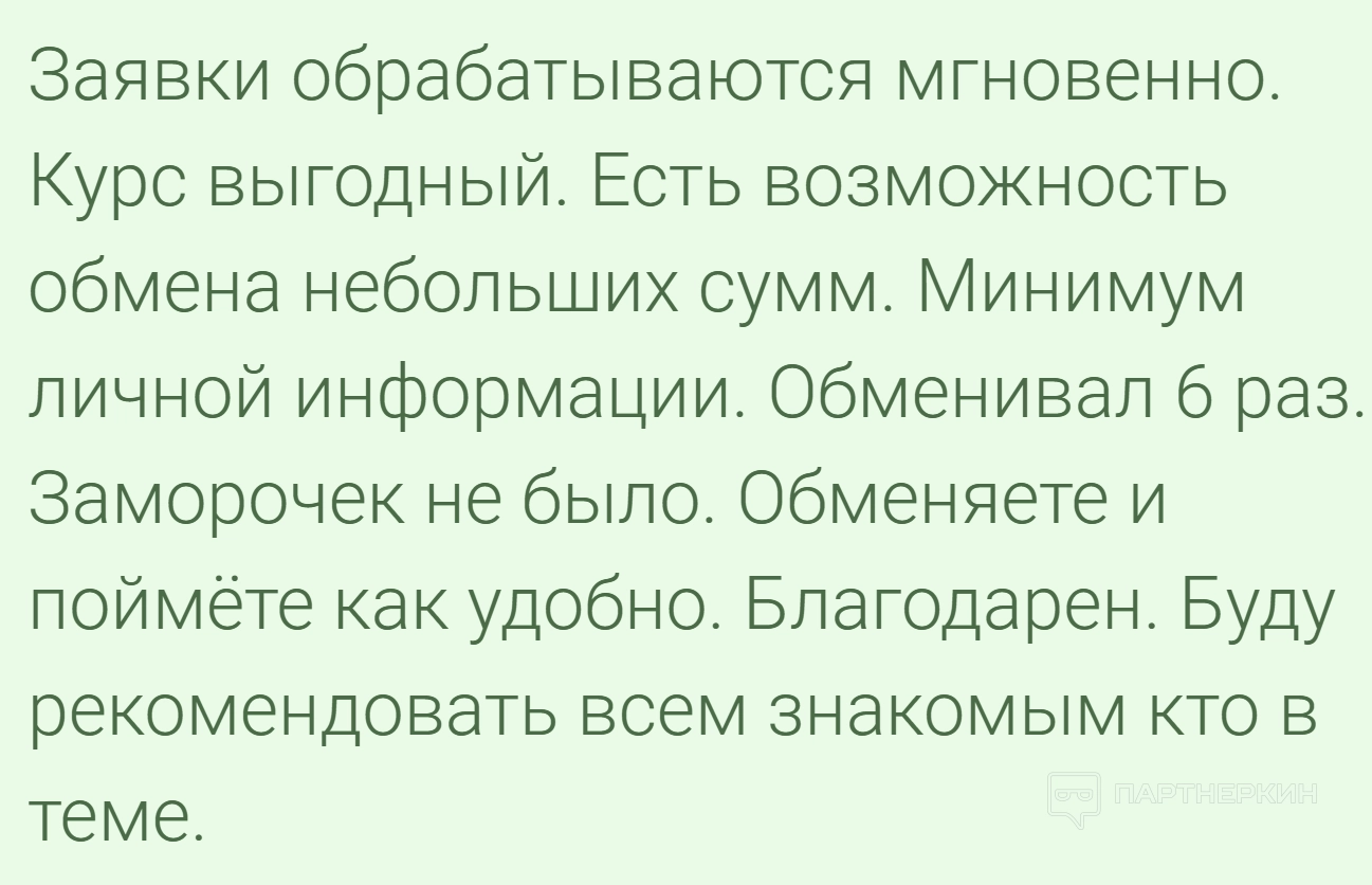 Некоторые пользователи хвалят выгодные курсы, уверяя, что сервис обеспечивает честный расчет без скрытых комиссий. Для многих удобством стало минимальное количество запрашиваемой личной информации, что ускоряет процесс регистрации и обмена: