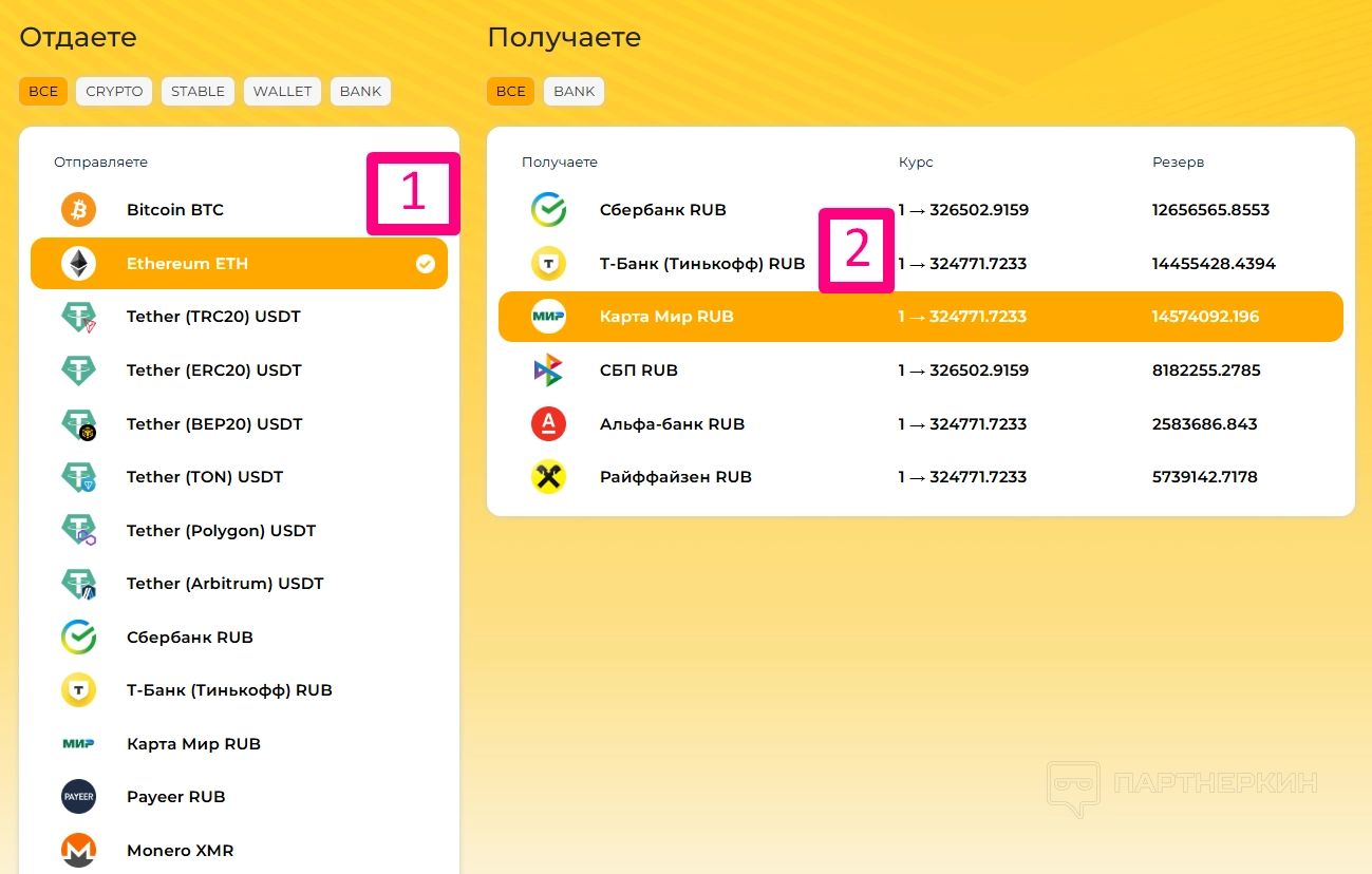 Сначала необходимо выбрать валюту для отправки и получения. Это делается с помощью простого меню на главной странице: слева представлены варианты для отправки, справа — доступные направления для получения. Курс обмена и текущие резервы отображаются рядом.