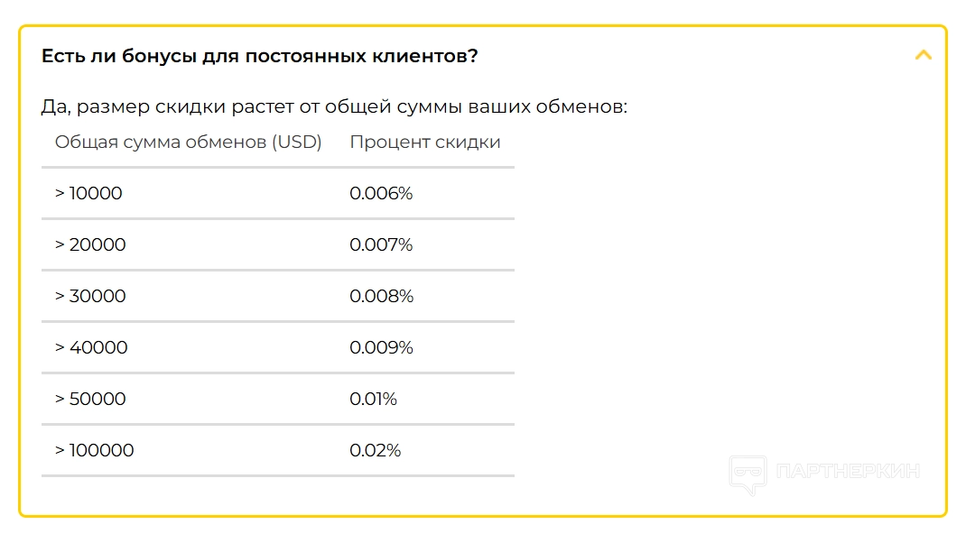Платформа также предлагает систему скидок для постоянных клиентов. Размер скидки зависит от общей суммы операций, проведенных через сервис, и растет с увеличением объема обменов. Например, если общий объем обменов превышает $10,000, предоставляется скидка в размере 0.006%, а для клиентов с объемом операций более $100,000 скидка достигает 0.02%. Несмотря на скромные проценты, такие скидки могут быть полезны для тех, кто регулярно совершает крупные сделки.