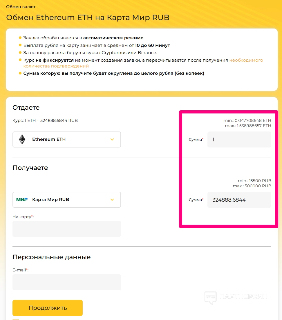 После выбора направлений обмена на странице появляется форма для ввода данных. Нужно указать сумму — либо отправляемую, либо желаемую к получению. При этом система автоматически рассчитывает итоговую сумму с учетом курса и комиссии. Это удобно, так как пользователь сразу видит, сколько средств поступит на указанный кошелёк или карту. Если сумма не укладывается в установленные лимиты (например, минимальная или максимальная), сервис сразу уведомляет об этом.