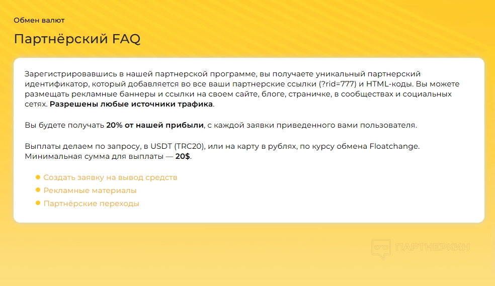 - Низкий порог для выплат — минимальная сумма всего $20, что позволяет регулярно выводить заработанные средства даже при небольшом объеме привлеченных клиентов.