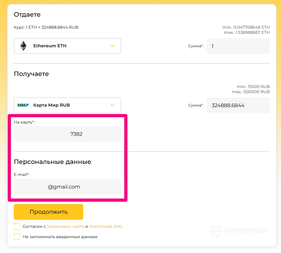 Следующим шагом вводятся реквизиты для перевода. Для криптовалюты это адрес кошелька, для банковских переводов — номер карты или счета. Также требуется указать контактный e-mail, который служит дополнительным уровнем безопасности и позволяет сервису уведомлять о статусе заявки.