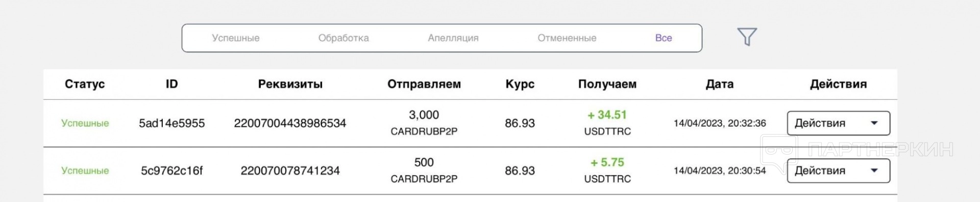 Ниже история заявок на пополнение и вывод. Вы можете отфильтровать их по статусу или найти по ID, реквизитам и способу пополнения: