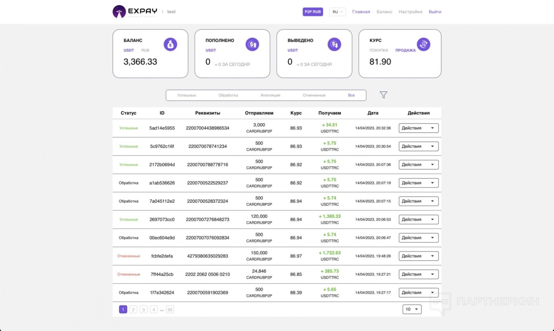 - Курс (Rate) — курс на конвертацию входящих(покупка) и сходящих(продажа) транзакций.