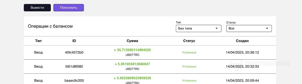 На вкладке «Баланс» можно отслеживать все транзакции. Чтобы пополнить и вывести деньги, нужно использовать соответствующие кнопки «Вывести» или «Пополнить». Также вам понадобится код, который сообщит менеджер после подключения
