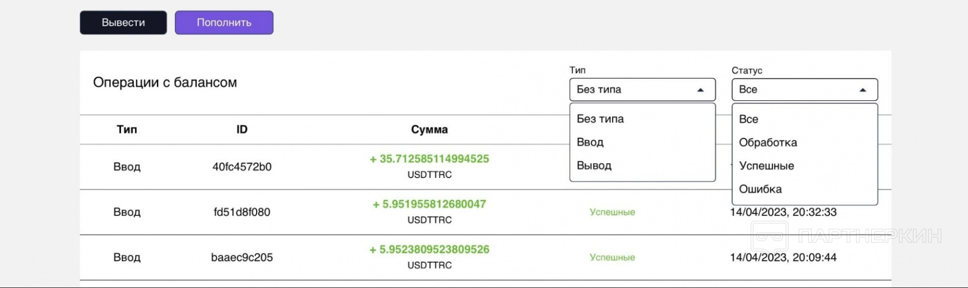 Ниже история операций. Вы можете фильтровать ее по типу и статусу:
