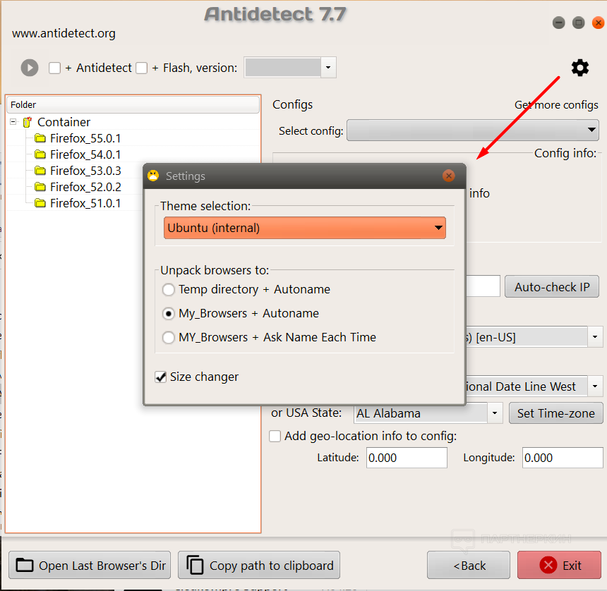 После нажатия на шестеренку откроются настройки, где можно выбрать внешний вид и указать директорию хранения браузеров. Автоматически может стоять папка «Temp», но она периодически самоочищается, так что если важно не потерять созданные версии — лучше выбрать «Antidetect folderMy_browsers».