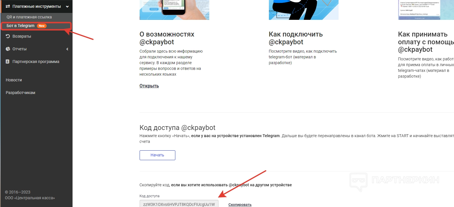 Также принимать платежи можно с помощью специального бота в Telegram. Для этого переходим во вкладку «Бот в Telegram» и находим на странице специальный код доступа, который нужно будет использовать для активации бота. Далее открываем Telegram, запускаем бота @ckplaybot и вставляем в него скопированный код.