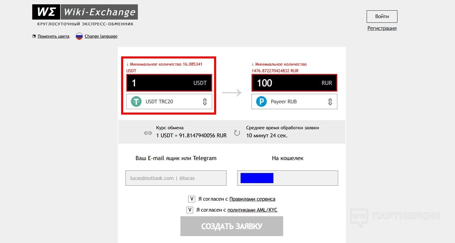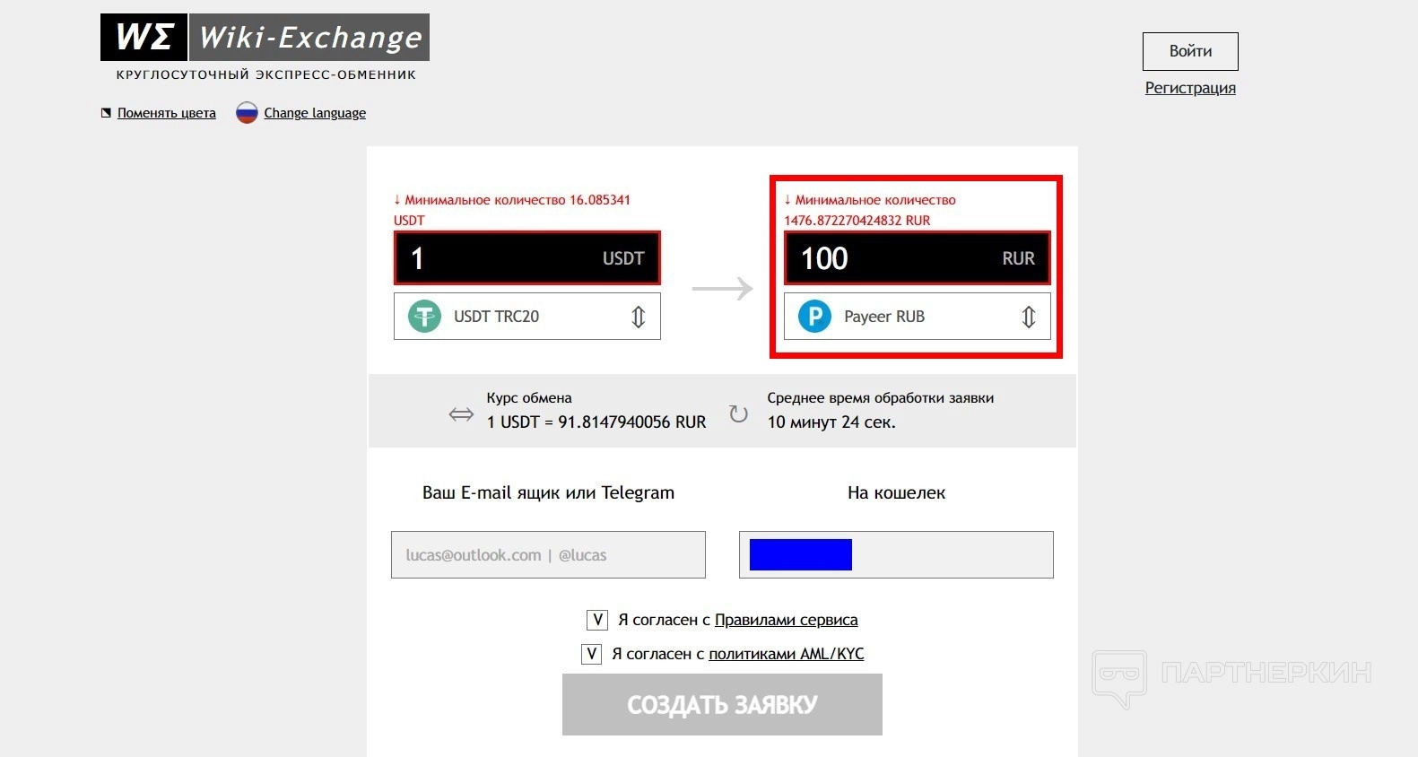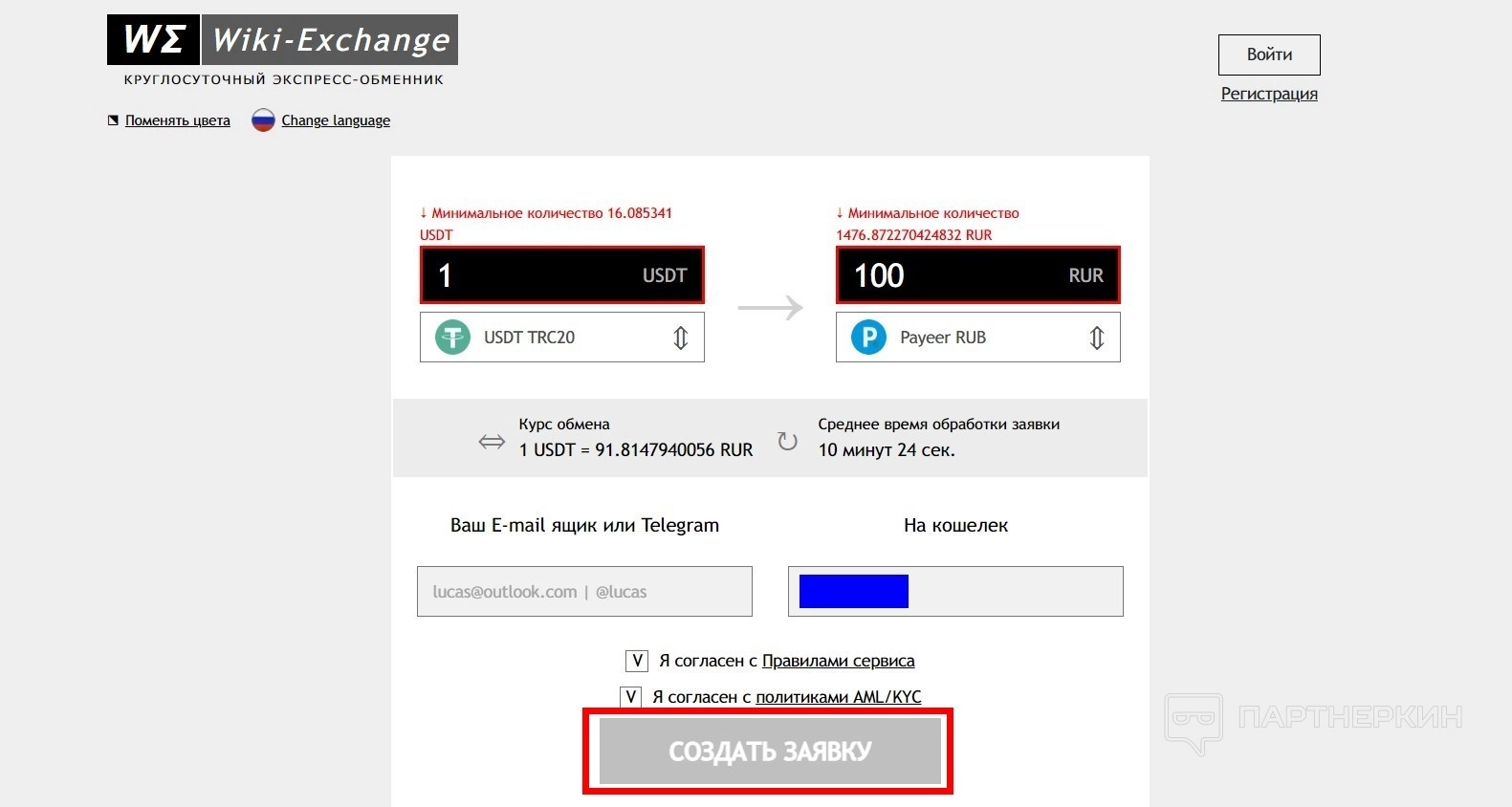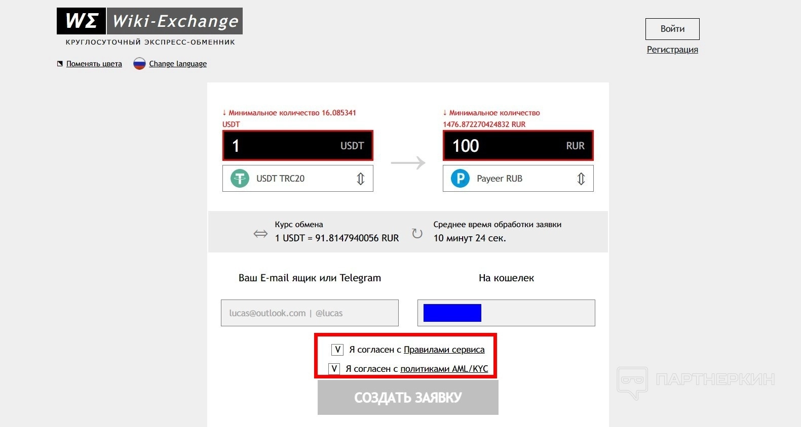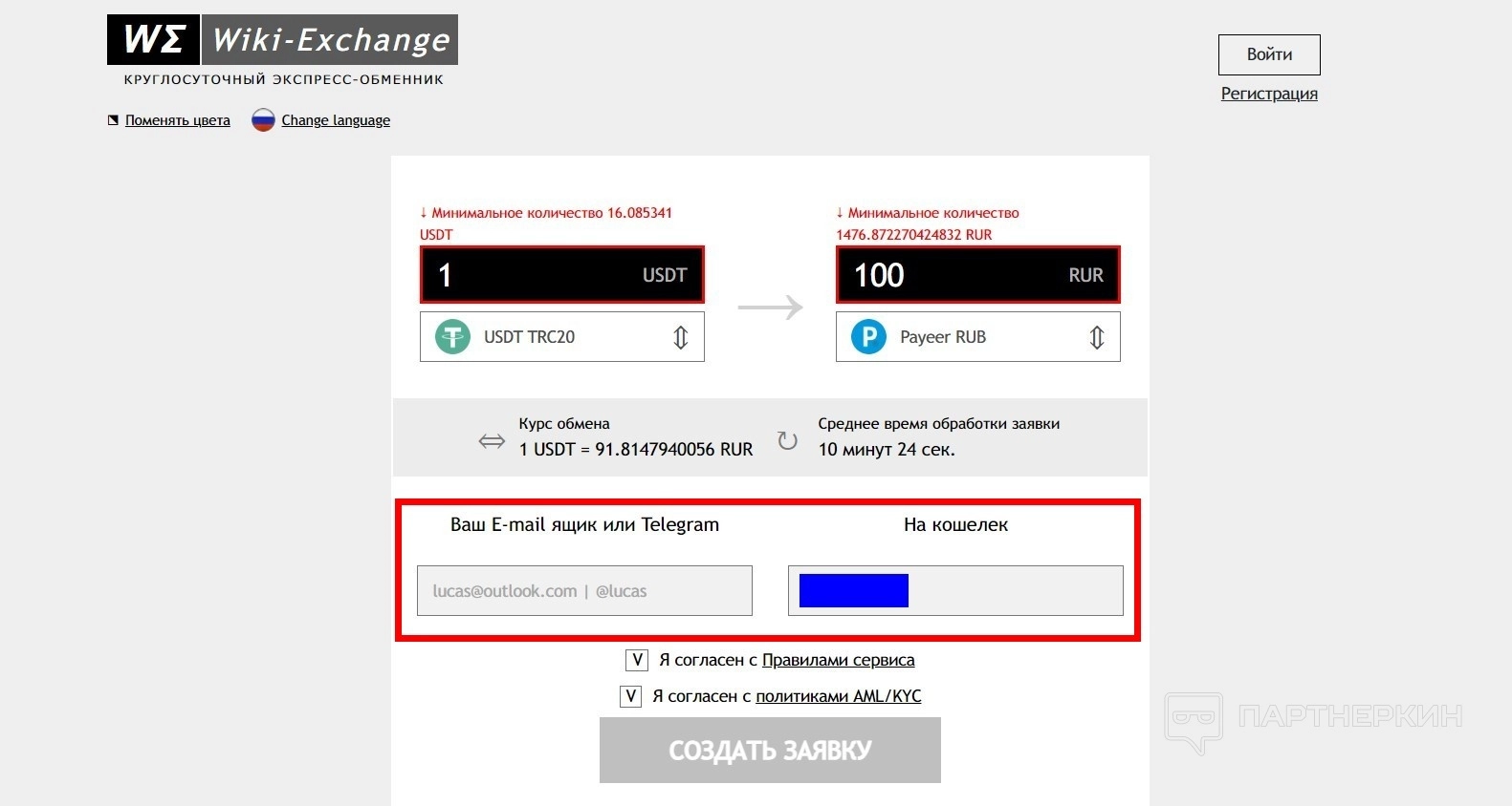 - Добавьте свои контактные данные: email и номер кошелька или карты.