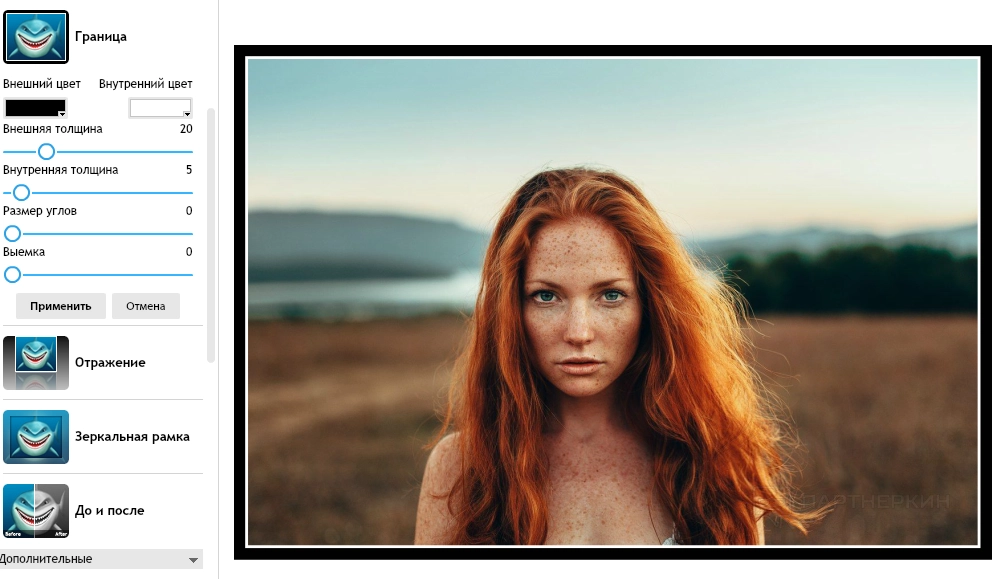 - зеркальная рамка (цвет, толщина, размер углов, лоск, тень);
