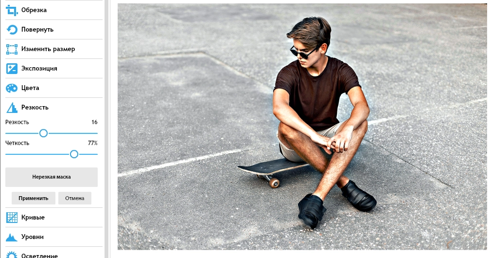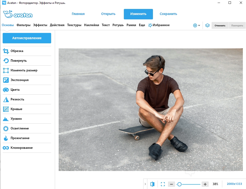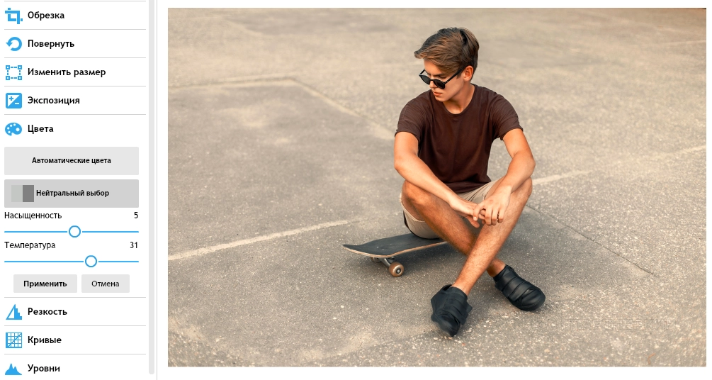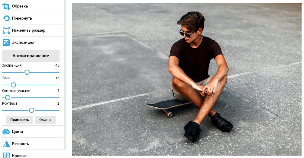 Функция «Основы» включает следующие инструменты: обрезка, повернуть, изменить размер, экспозиция, цвета, резкость, кривые, уровни, осветление, прожигание, клонирование.