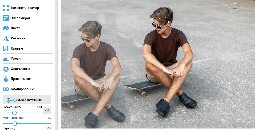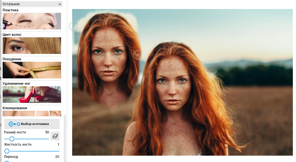Клонирование. Пользователь может клонировать объект на фотографии. Необходимо установит размер кисти, жесткость и переход. Пример: