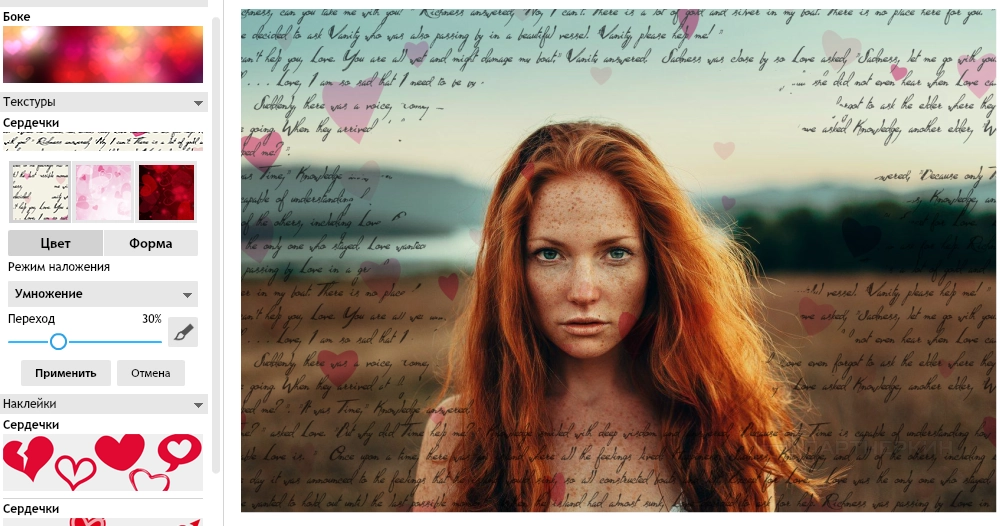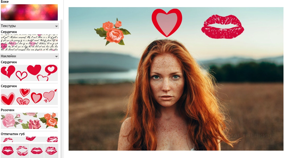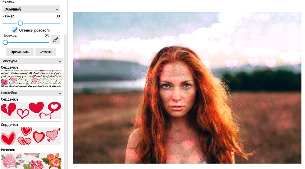 - вырезанное сердце (текстура, цвет, размер фокусу, размер краев, угол, интенсивность, возможность выбрать несколько типов наложения);