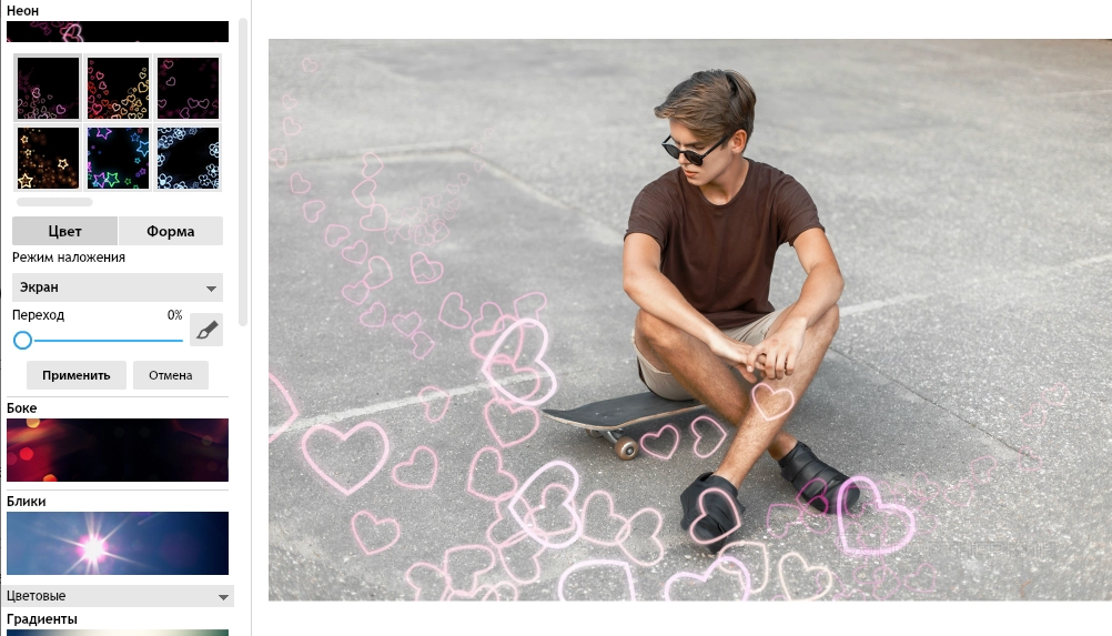 В этой категории для пользователя доступен только один пункт — сердечки. При нажатии на раздел можно выбрать три текстуры, задать им цвет, форму, переход и настроить режим наложения: добавление, затемнение, разница, жесткий свет, осветление, умножение, перекрытие, экран, вычитание.