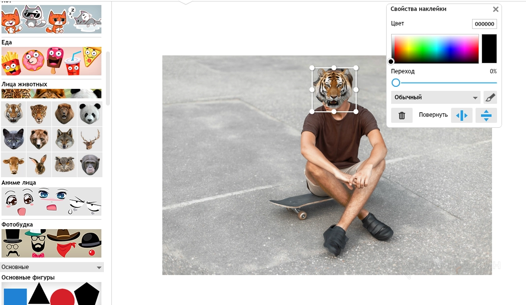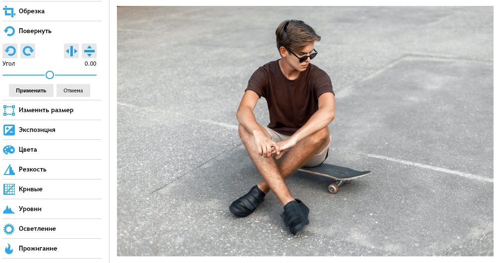 С помощью инструмента можно повернуть изображение на 90 и 180 градусов. Есть возможность установить другой угол: от -45 до 45 градусов. Доступна опция отзеркаливания изображения — по вертикали и горизонтали.