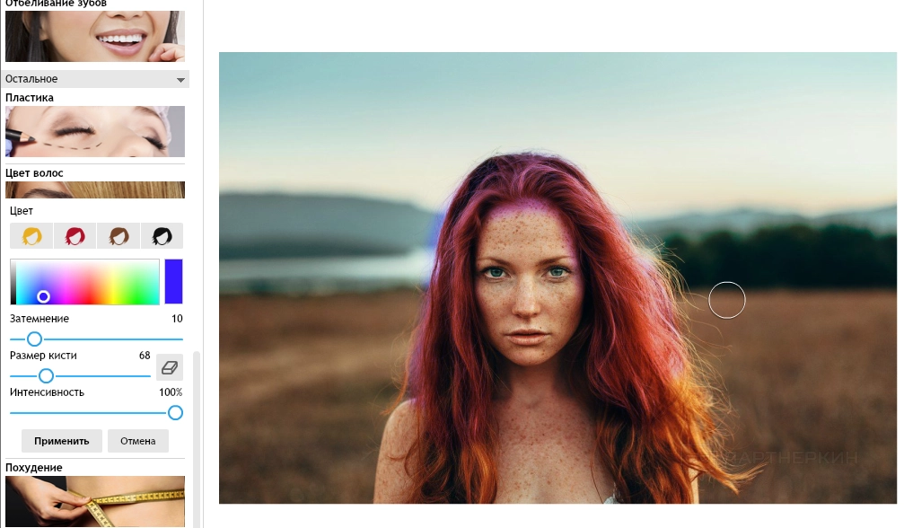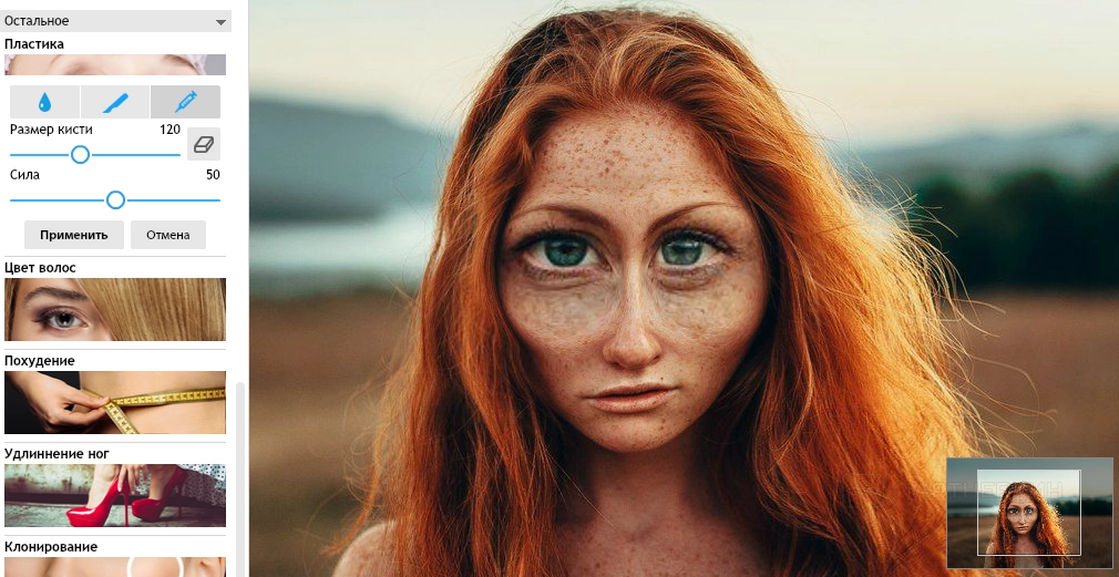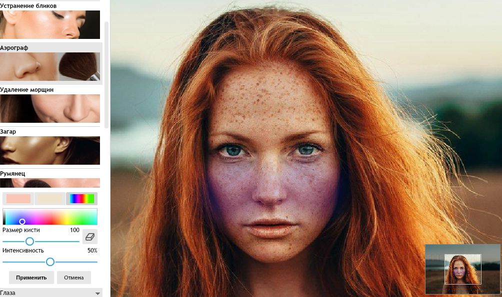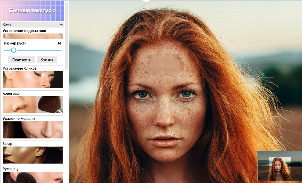 Устранение недостатков. Пользователь может установить размер кисти и устранить дефекты. На примере с девушкой это выглядит так (небольшие изменения на лбу):
