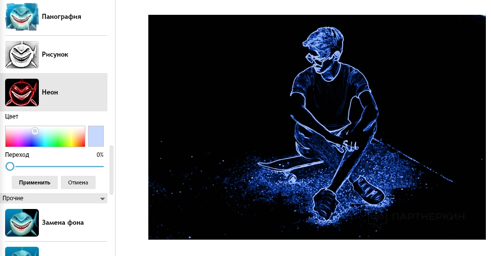 Чтобы перейти к основным функциям программы, нужно нажать «Открыто фото» (и загрузить собственное изображение) или кликнуть на «Перейти к эффекту» (откроется стандартная картинка от разработчиков