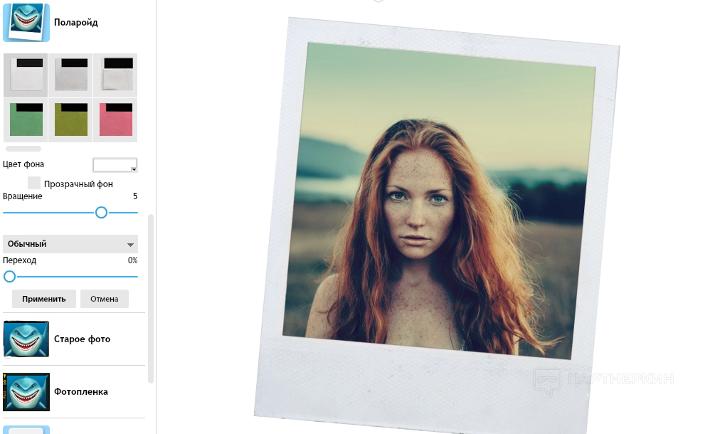 - поларойд (цвет фона, прозрачность, вращение, переход, тип наложения: обычный, выцветший от солнечных лучей, выгоревший красный, зеленый);