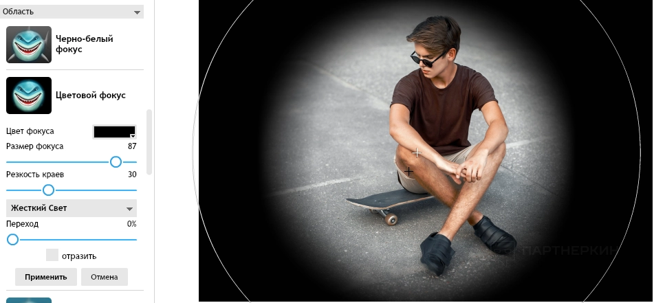 - цветовой фокус (размер фокуса, резкость краев, переход, несколько режимов наложения);