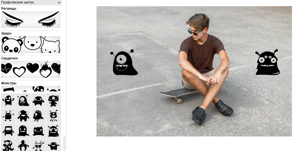 В этой категории находятся дополнительные эффекты, текстуры, наклейки и сердечки.