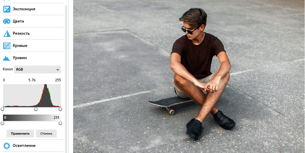 Инструмент корректирует яркость, контраст и диапазон цвета. Для работы доступно четыре канала: RGB, красный, зеленый, синий. Установить параметр можно от значения 0 до 255.