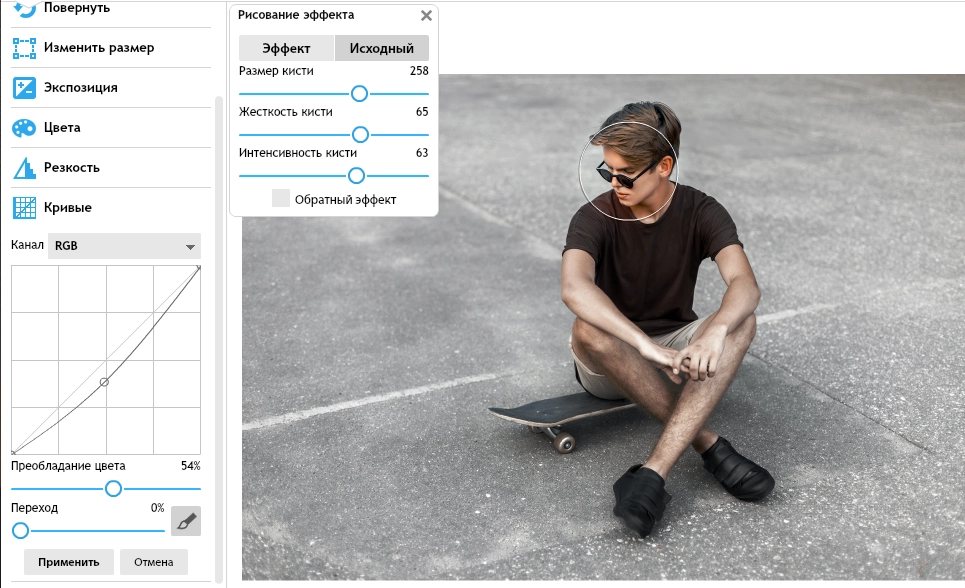 В разделе «Кривые» есть инструмент кисть, которому можно задать размер, жесткость и интенсивность. После настройки пользователь может сделать отдельные участки фотографии светлее.