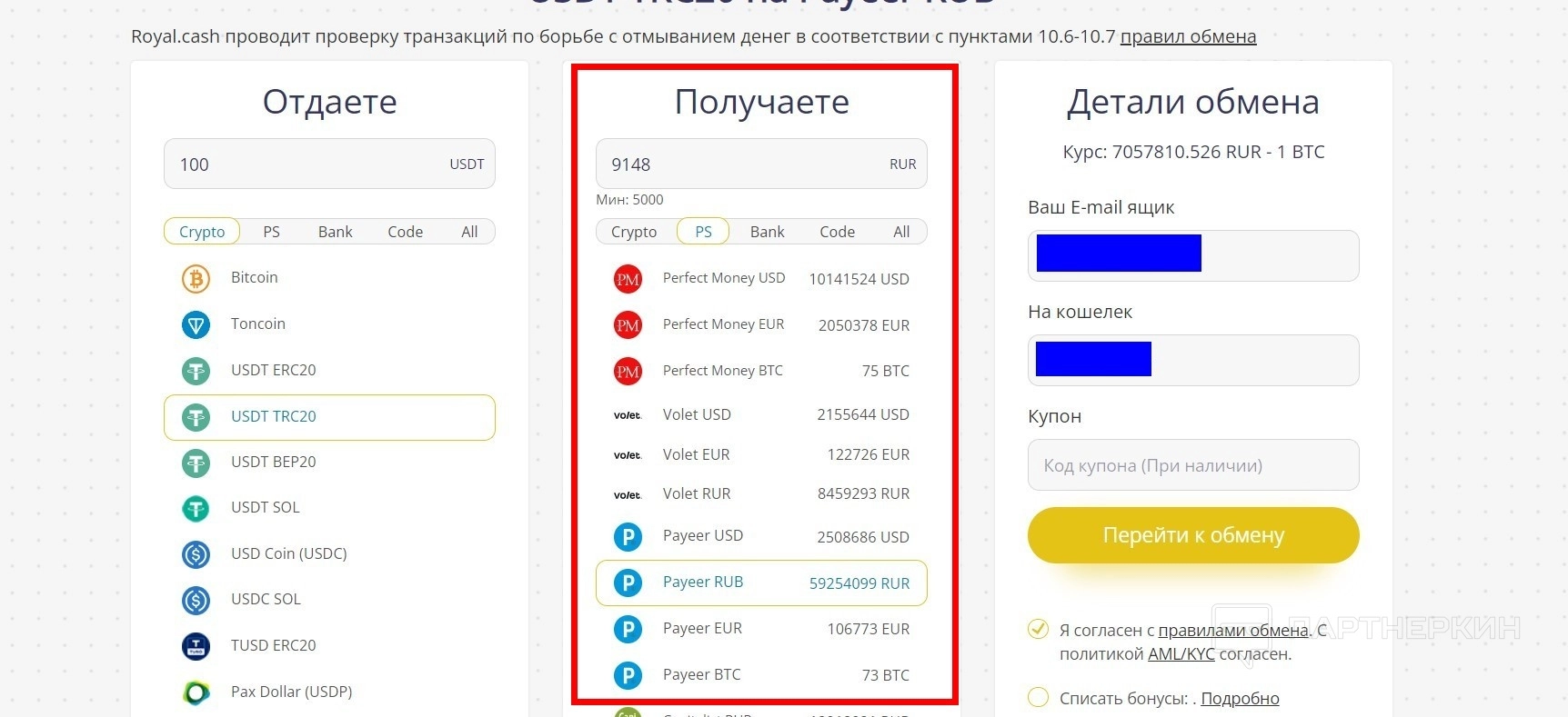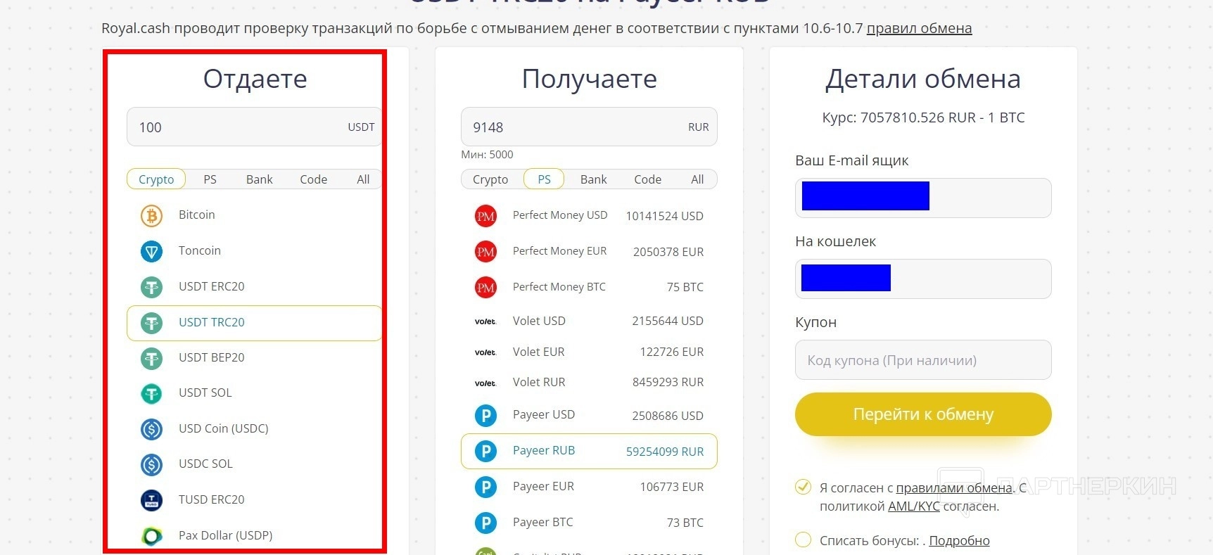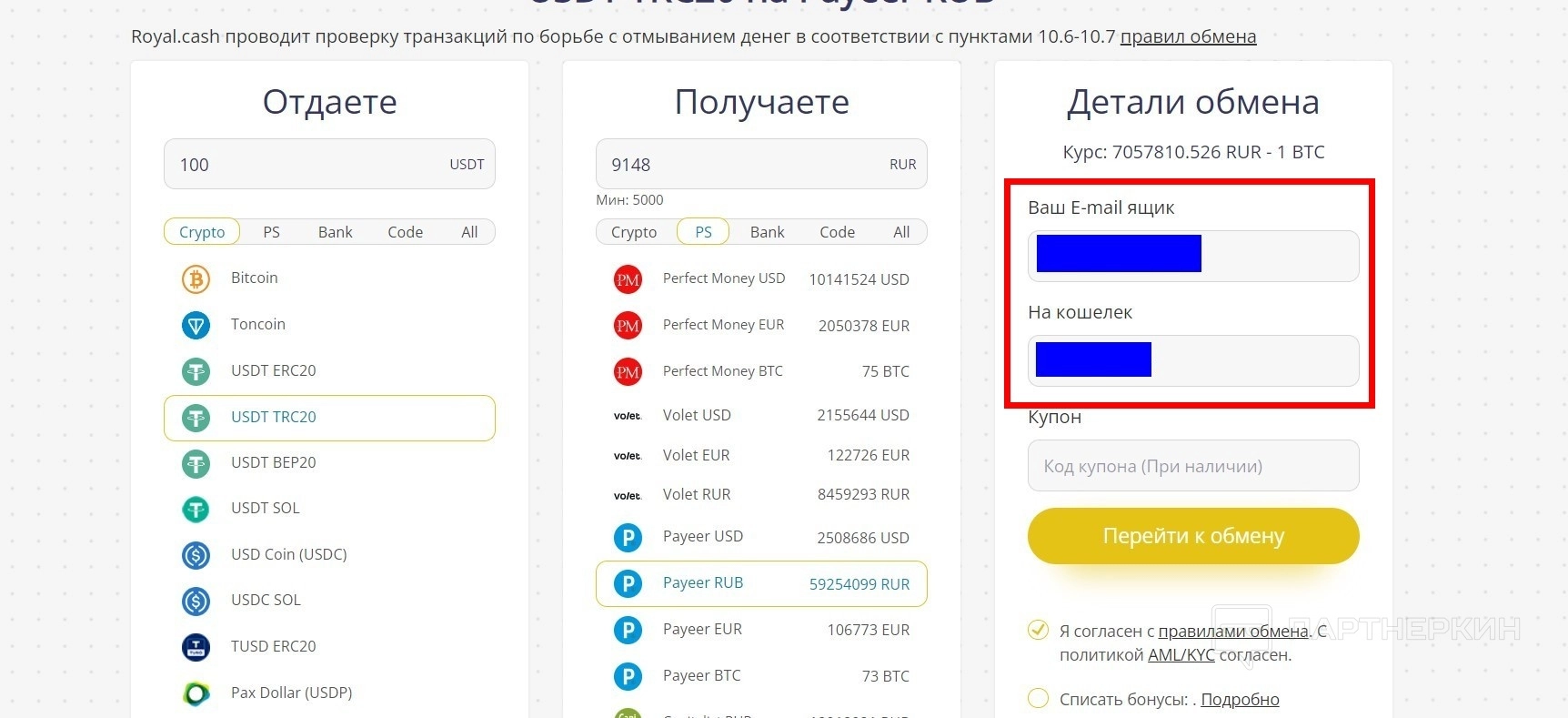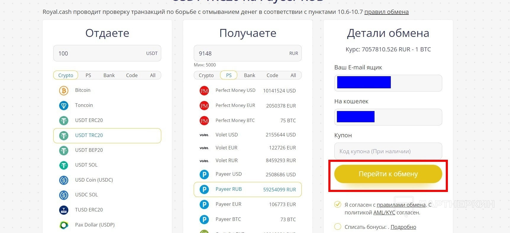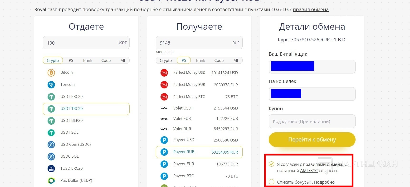 - После согласия с правилами обмена и политикой AML/KYC, вы можете также списать бонусы, если они имеются.