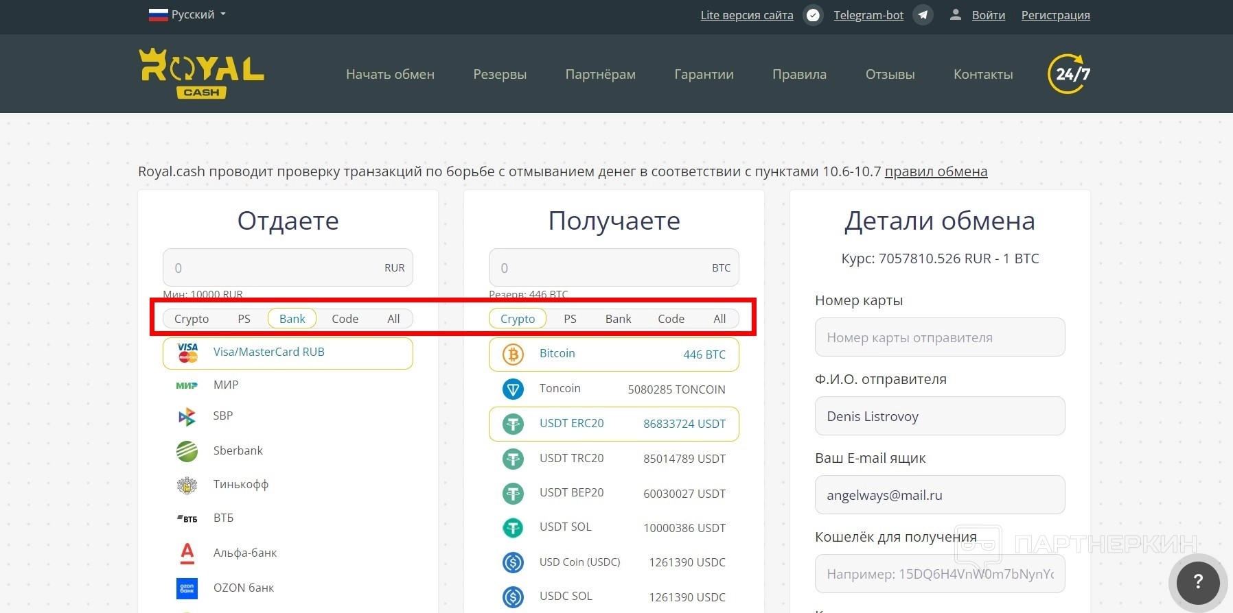 Это круглосуточный обменник валют, который известен своей высокой скоростью работы и удобством для пользователей. Обладая выгодной партнерской программой и предлагая скидки на обмен, он становится привлекательным выбором для тех, кто ценит экономию и эффективность. Сервис предлагает широкий выбор направлений обмена, включая различные валюты и цифровые монеты, чтобы удовлетворить потребности разнообразной аудитории.