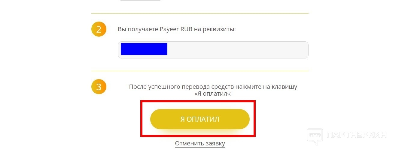 - После нажатия кнопки «Я оплатил», заявка поступит в обработку. Деньги поступят на счет платежной системы, а затем на кошелек пользователя после завершения транзакции.