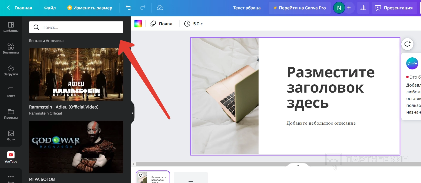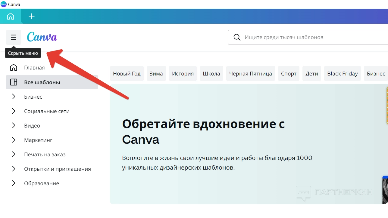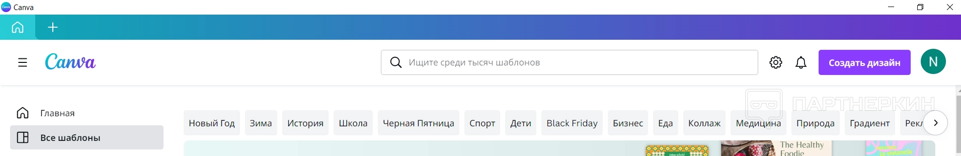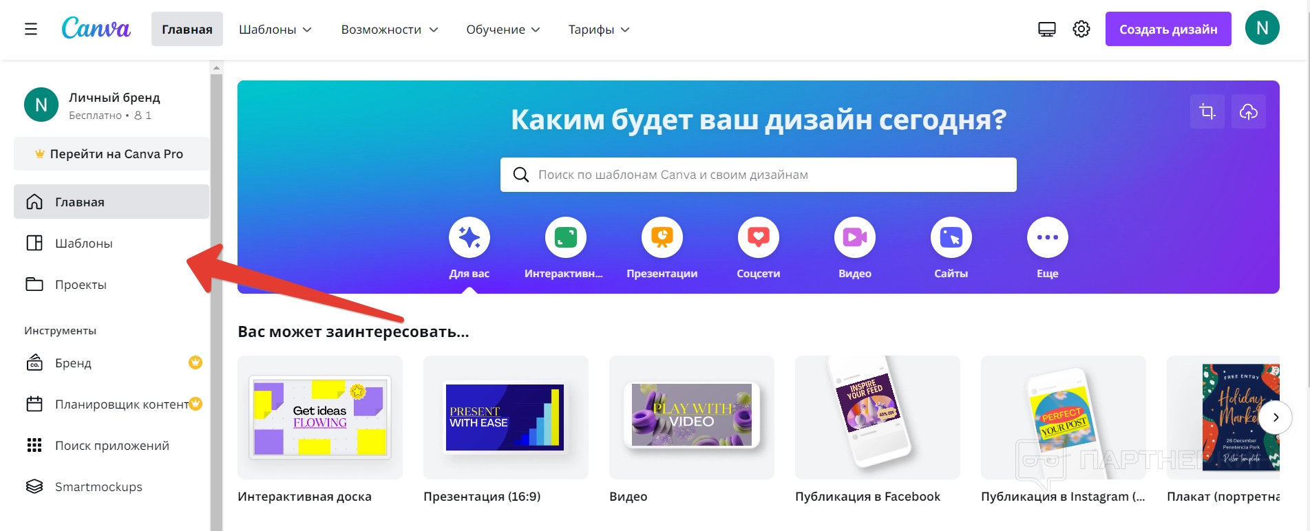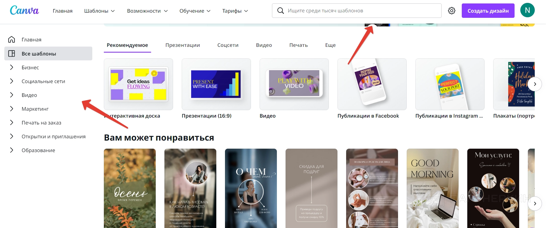 Шаблоны . Если перейти в раздел с шаблонами, то с правой стороны вверху появится строка поиска по названиям шаблонов. Меню с левой стороны также меняется — в нем отражаются виды шаблонов вроде видео, социальные сети, открытки и так далее.