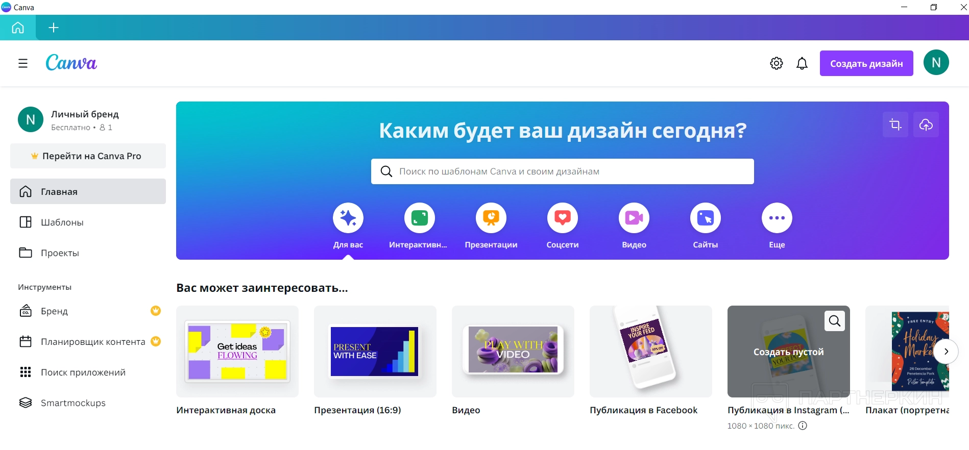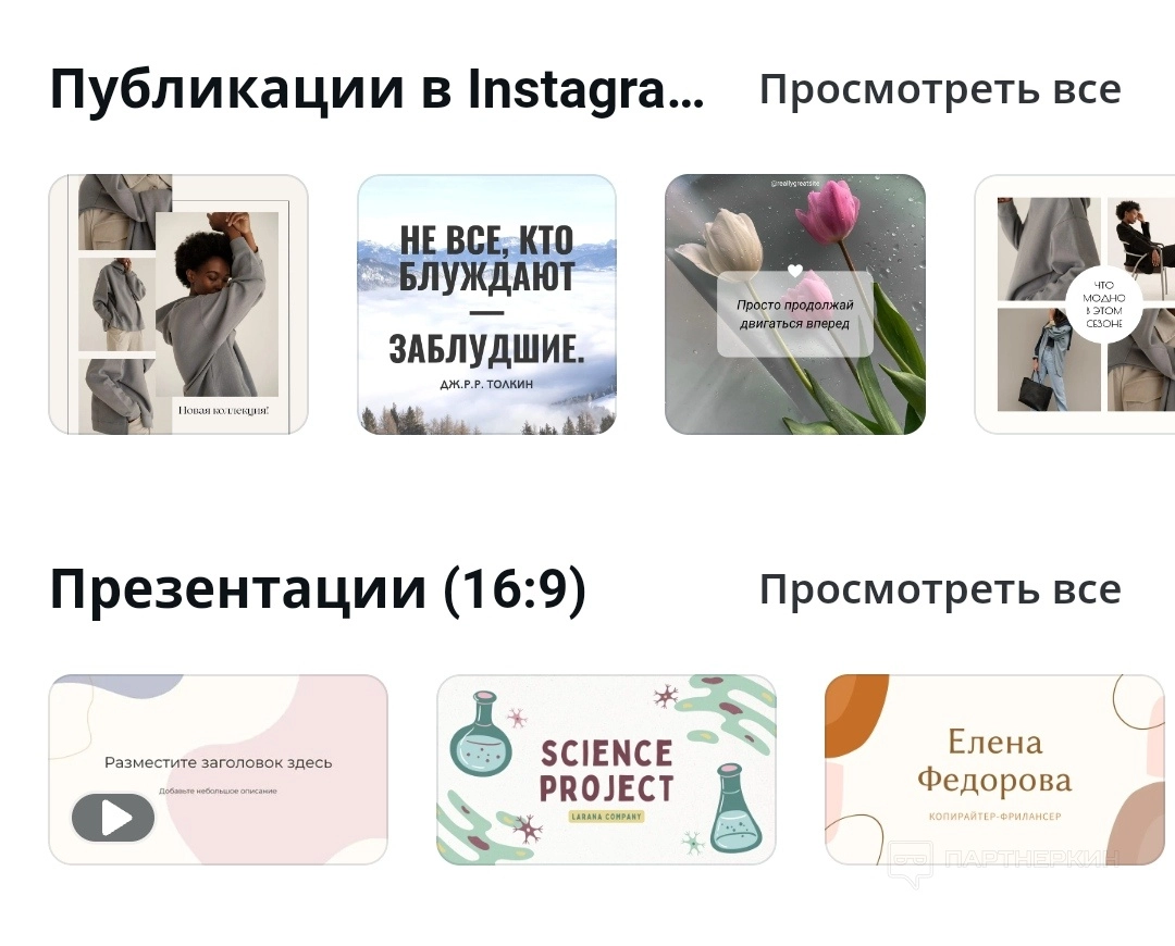 Главная . С самого начала перед пользователем открывается главный экран — на нем показывают актуальные варианты шаблонов, последние дизайны на аккаунте, а также примеры шаблонов по разным группам. Например, в формате истории для Инстаграм*, презентации, логотипа:
