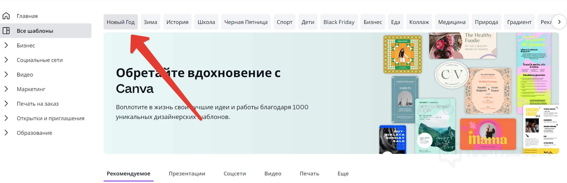 Для облегчения поиска добавили тематические названия шаблонов наверху. Например, если нажать на «Новый год», то система откроет все шаблоны новогодней тематики.