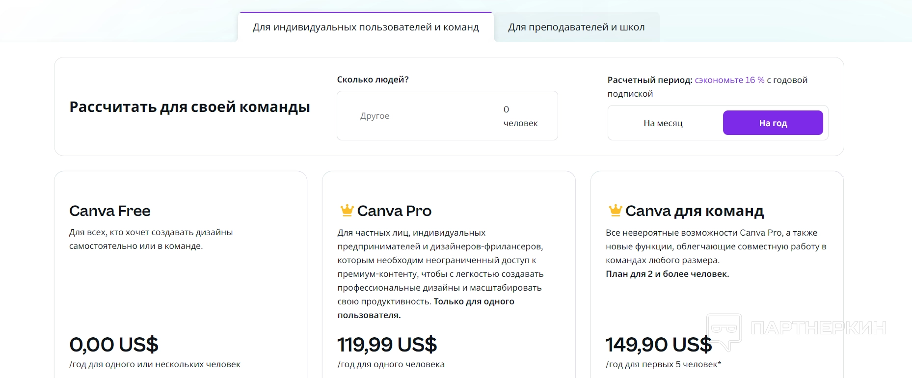 Тарифы . В тарифах подробно описывают расценки для каждого сегмента аудитории. Если в приложении пользователю рассказывают только про Canva Pro, то здесь также показали тариф для команд из двух и более человек.