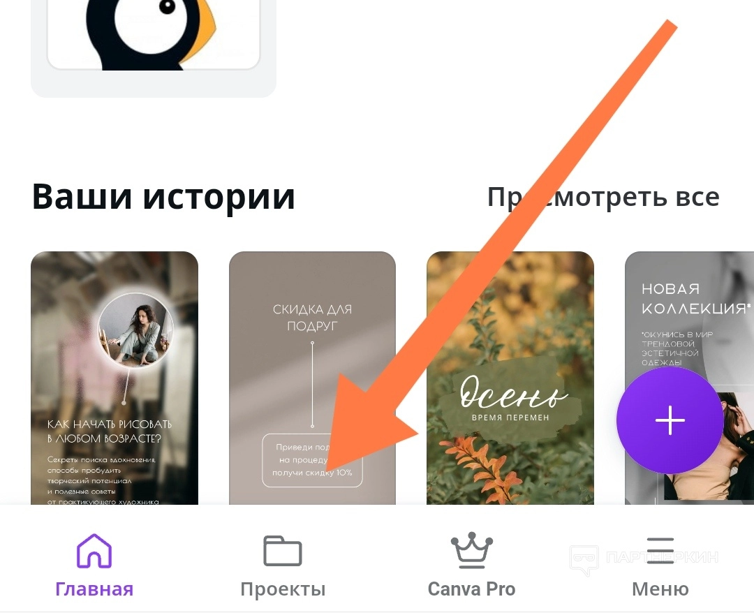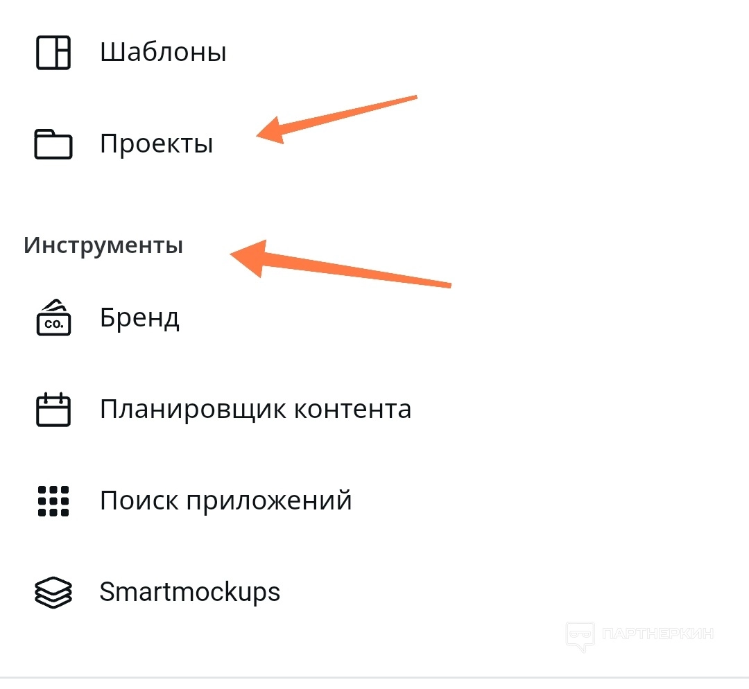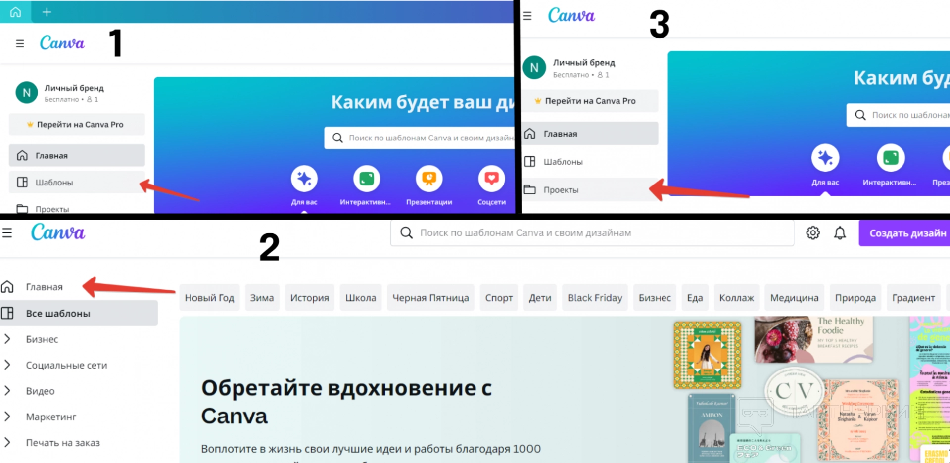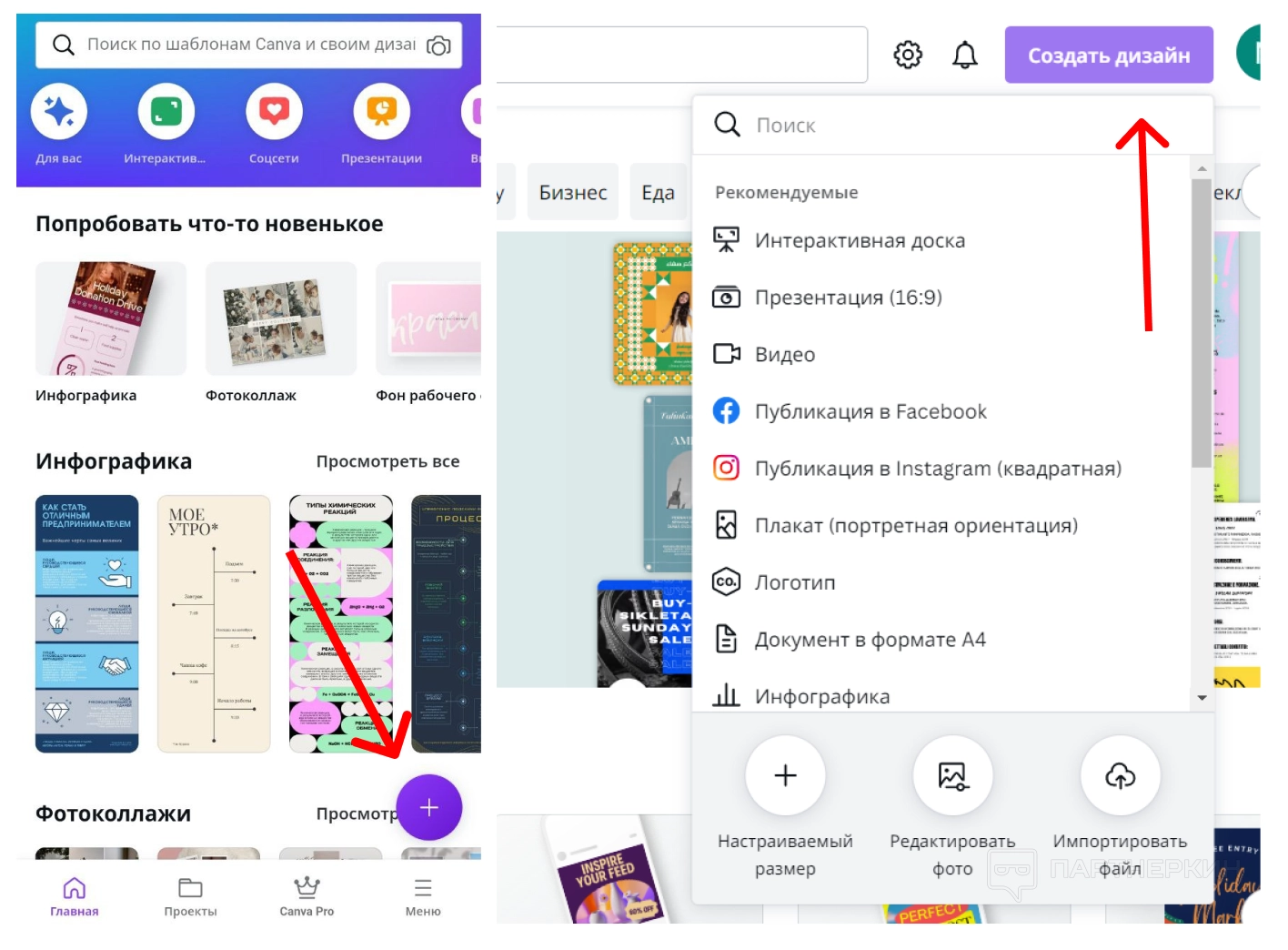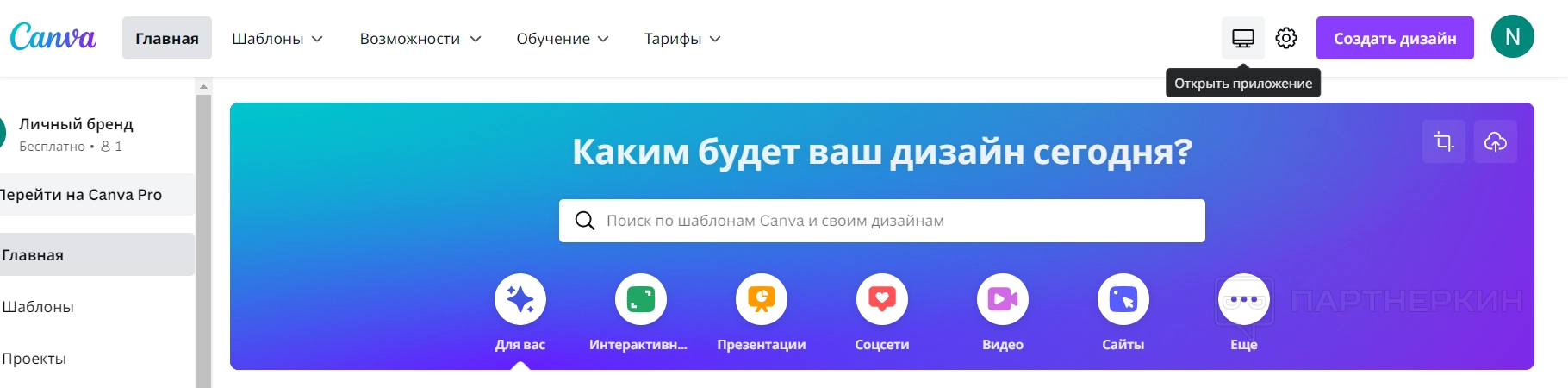 После входа внизу главного экрана можно увидеть разделы приложения — Главная, Проекты, Canva Pro и Меню. Давайте разберем каждый раздел подробнее.