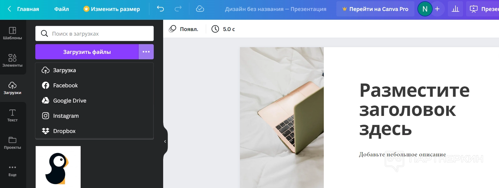 Загрузки . В этом разделе можно загружать собственные файлы — изображения, видео, аудио. Причем необязательно загружать их с компьютера или телефона — можно загрузить с Google Диска, Фейсбук*, Инстаграм* и Dropbox.