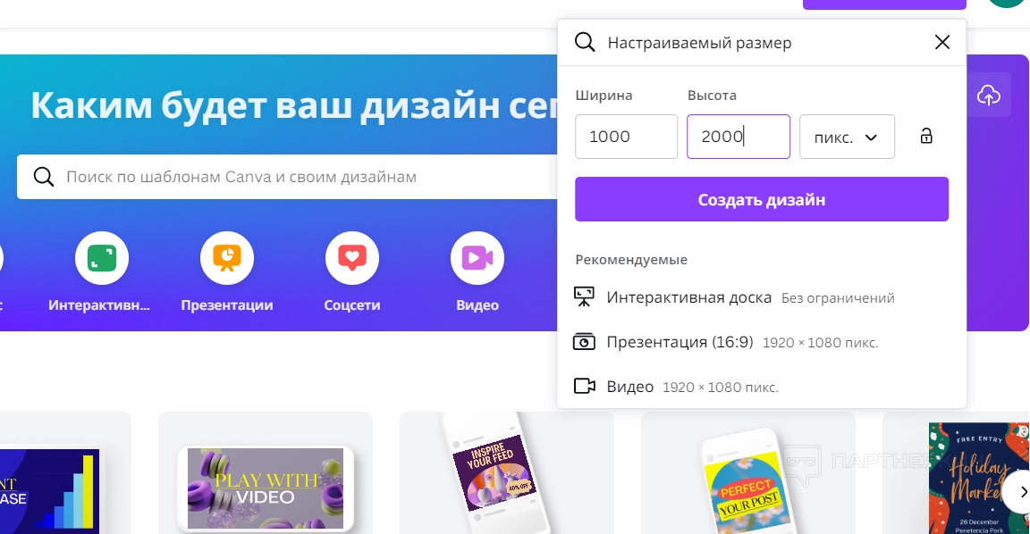 Можно настроить размер самостоятельно по кнопке «Настраиваемый размер» — например, указать 1000x2000 пикселей.