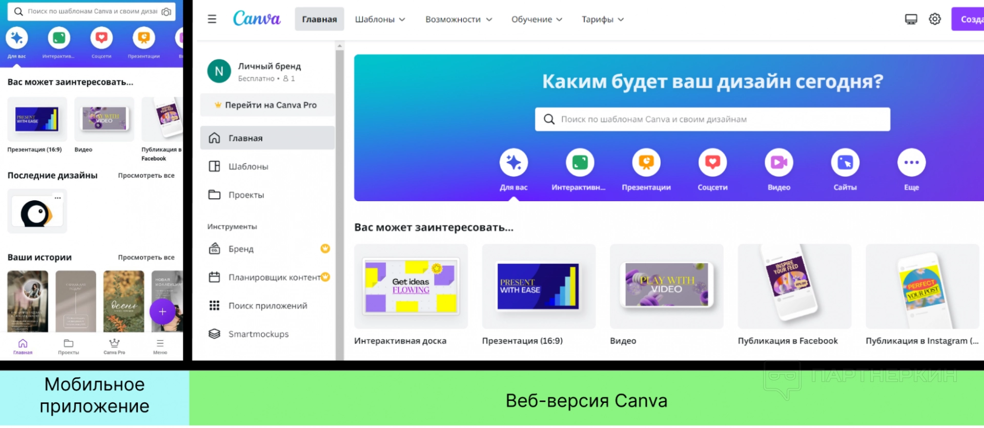 Главная . На главном экране не хватает визуального списка с шаблонами приложения — чтобы посмотреть доступные варианты, придется перейти в конкретный пункт с шаблонами. Также с левой стороны есть меню, в котором показывают данные учетной записи, раздел с шаблонами, проектами, брендом и планировщиком — все то, что в приложении было в отдельном разделе «Меню».