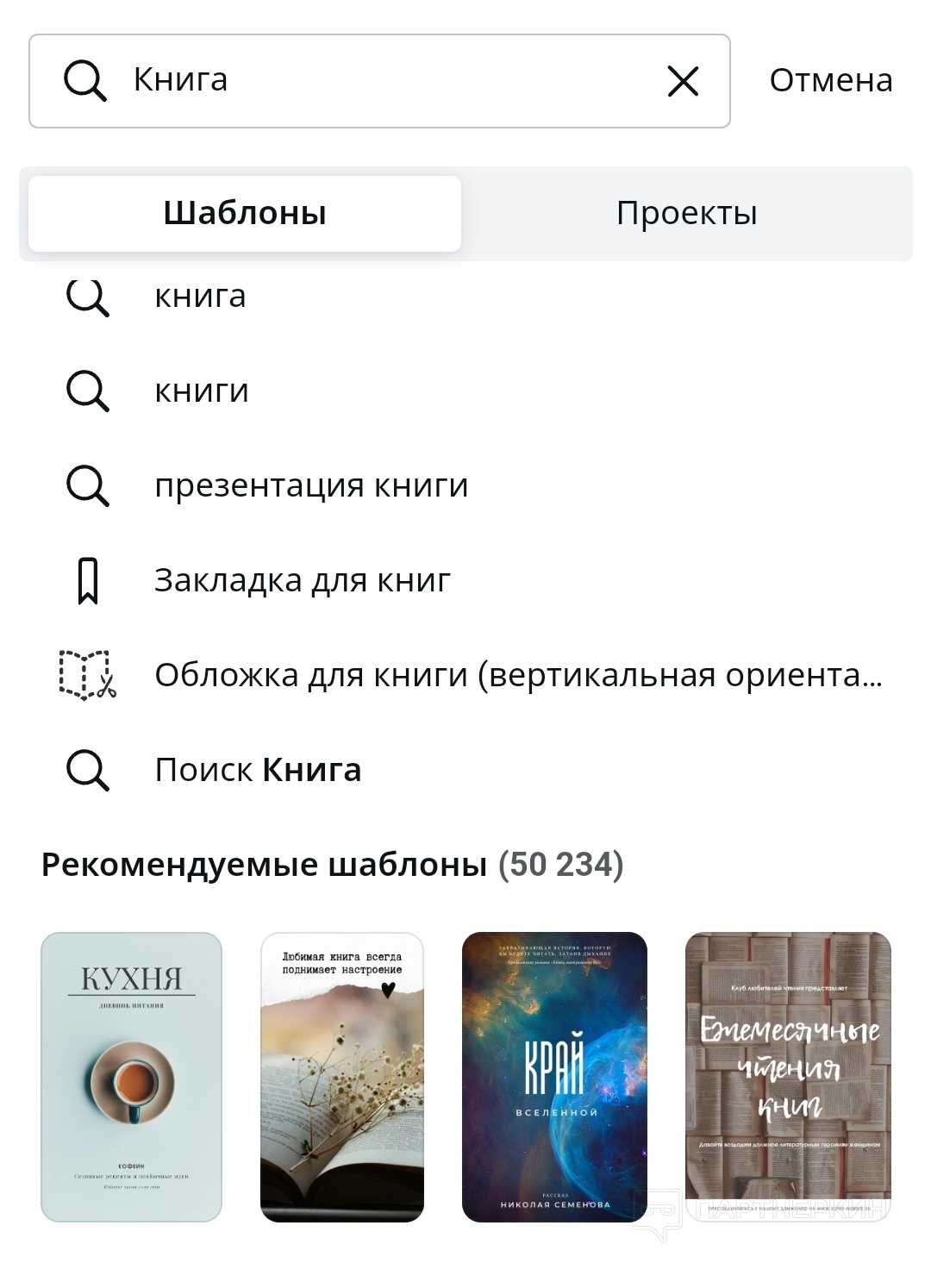 Вверху есть строка поиска, которая упрощает навигацию по шаблонам и собственным работам — достаточно ввести название и найти нужный вариант. Например, вводим «Книга», и система открывает шаблоны с вариантами оформления обложек книги.