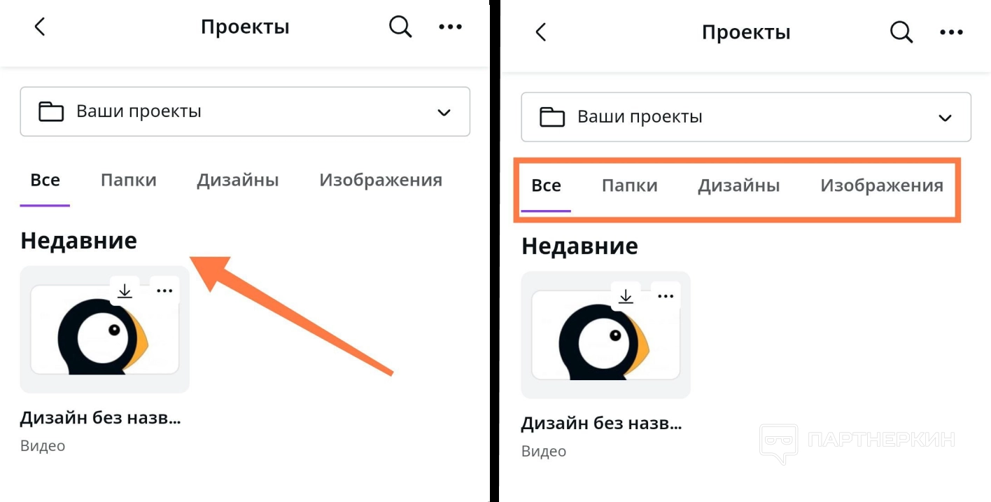 Проекты разделены на группы — папки, дизайны и изображения. Можно пролистать вниз до нужного раздела, а можно тапнуть на название вверху и сразу в него перейти — это спасает, когда работ много.