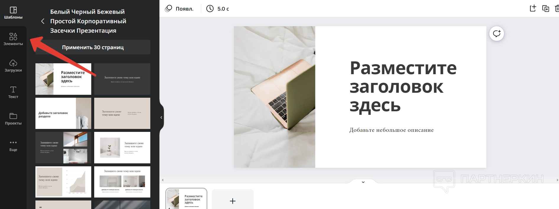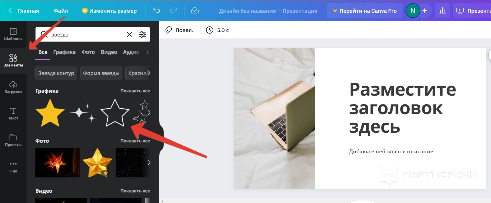 Элементы . В этом разделе можно найти отдельные элементы для дизайна — например, плашки, таблицы, рандомные фотографии, видео, аудио, диаграммы, стикеры, сетки и так далее. Для упрощения поиска лучше использовать поисковую строку — например, мы хотим добавить звезду на шаблон:
