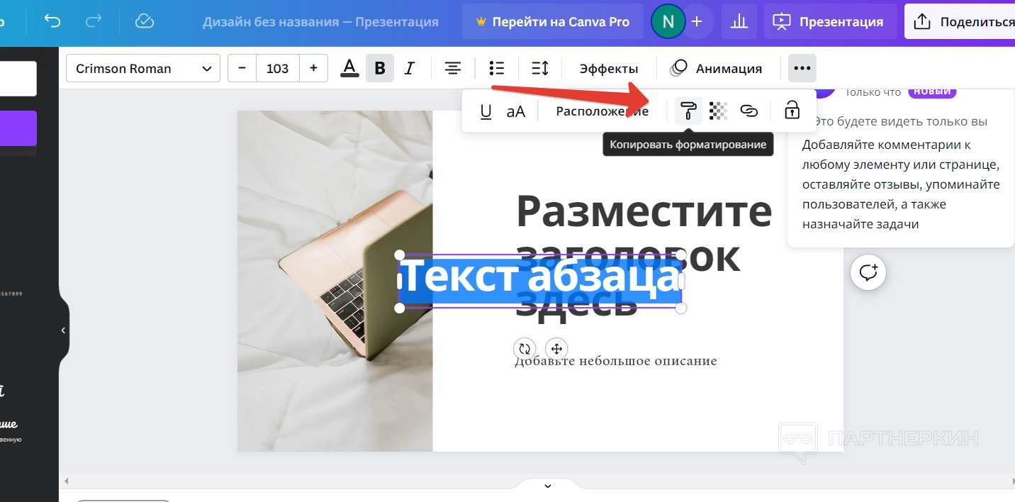 Если пользователь делает большой проект, в котором на каждой странице одинаковый шрифт, то настройки текста можно скопировать и перенести: