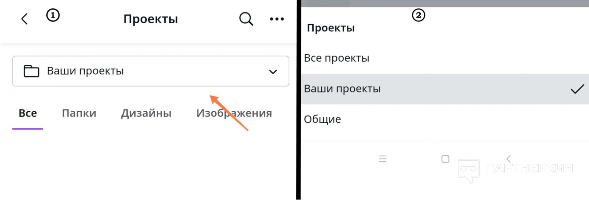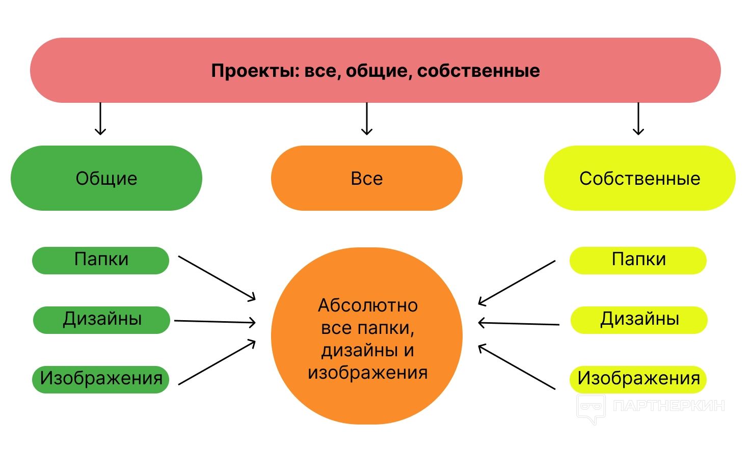 Наверху есть список, в котором можно выбрать характеристику проекта для упрощенного поиска — например, «Ваши проекты» или «Общие». Если над проектом работает команда, то можно сразу зайти в пункт «Общие» и найти нужный проект — в него могут входить и общие папки, и дизайны, и изображения.