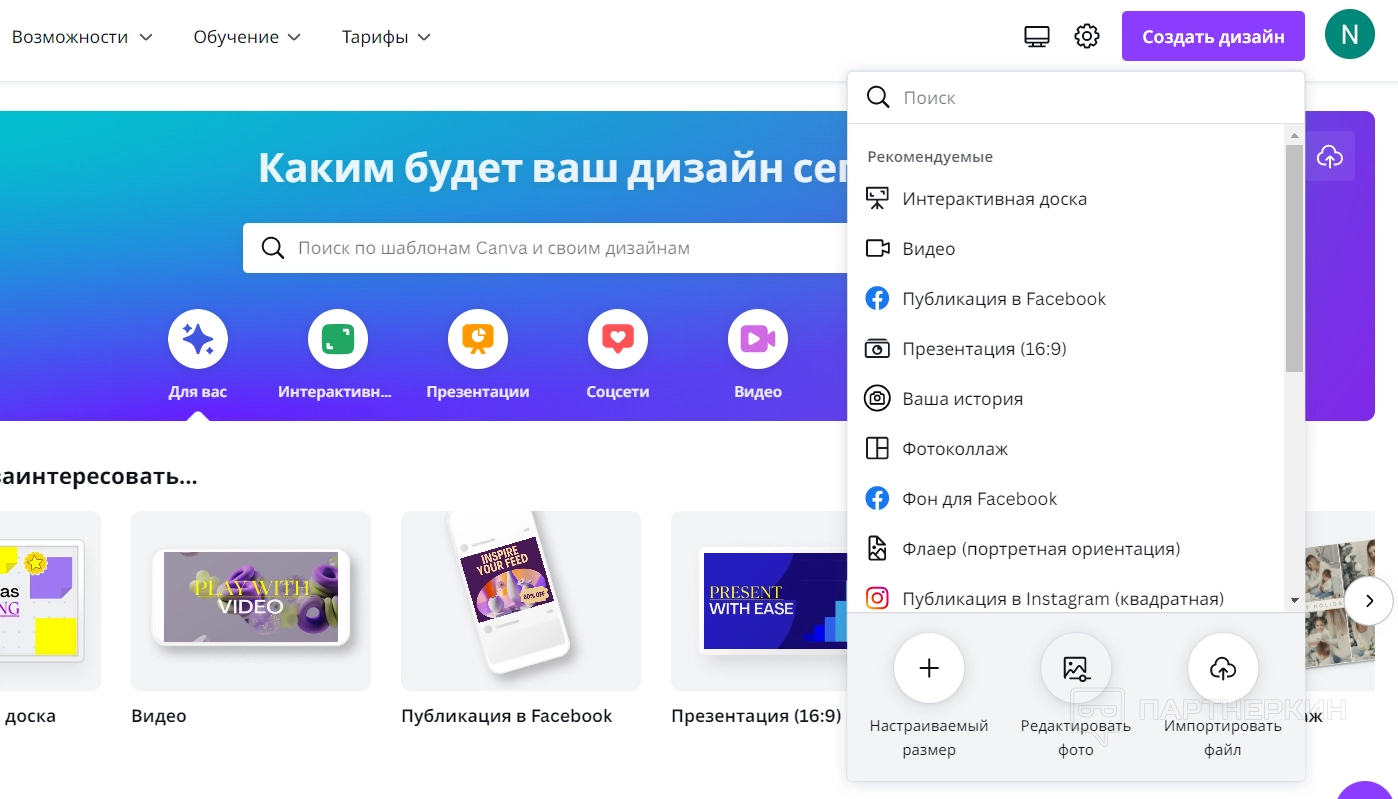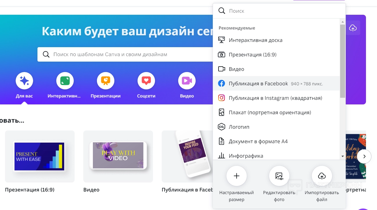 Чтобы создать шаблон, нужно выбрать формат — например, презентация, видео, публикация в Фейсбук* или Инстаграм*, плакат или логотип.