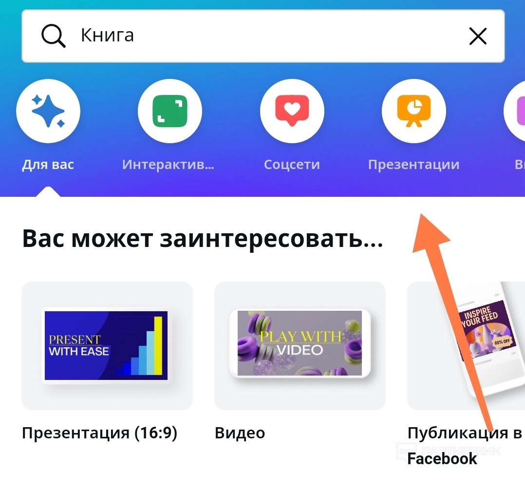 Под строкой поиска отметили все группы шаблонов для облегчения поиска — соцсети, презентации или раздел «для вас».