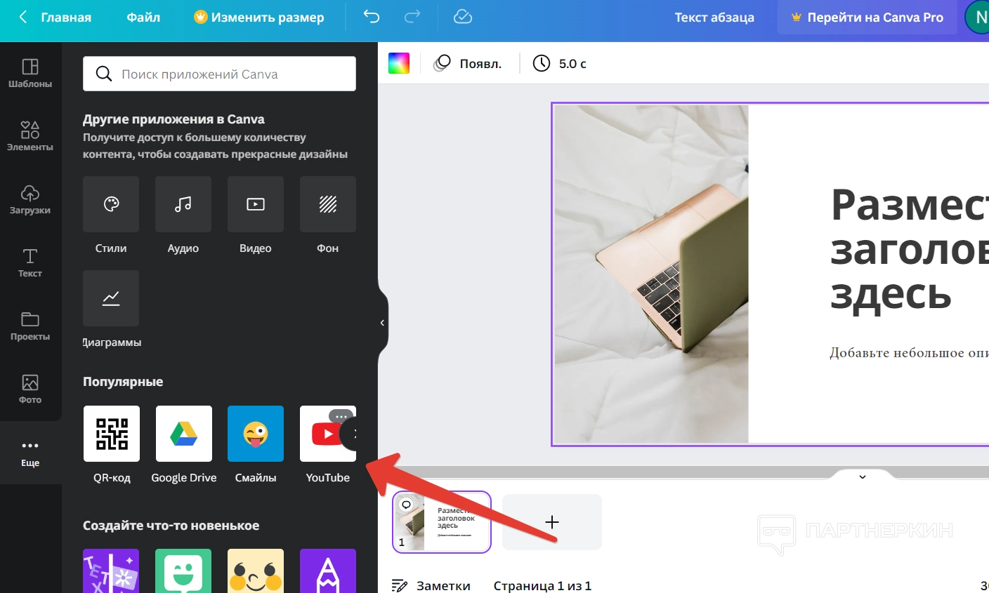 Но не только эти пункты можно добавить — в редакторе есть отдельные приложения, которые упрощают обработку или создание дизайна. К примеру, приложения для рисования, создания QR-кодов или YouTube.